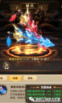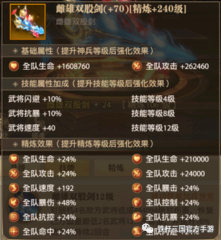 最后就是神兵升级时的附属加成了,首先需要䧳雄双股剑这个神兵跟闪避流塔配,主要因为神兵技能升级4级后在战斗开始时会提供10%的闪避。神兵精炼时也会给予基础属性的増加,神兵精炼满级可获得24%的闪避率。