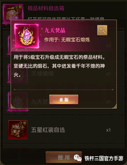 获得方法:参加每月活动累充奖励箱就可获得九天焚晶,使用九天焚晶升级5级宝石就可获得6级无睱品质的宝石了。