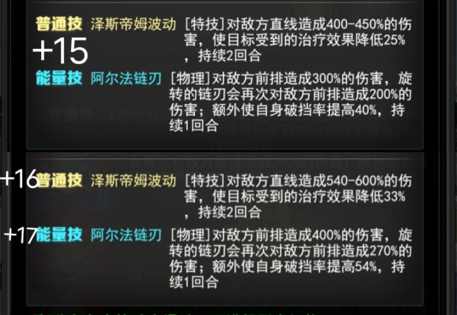 +17能量技阿尔法链刃[物理]对敌方前排造成400%的伤害,旋转的链刃会再次对敌方前排造成270%的伤害;额外使自身破挡率提高54%,持续1回合