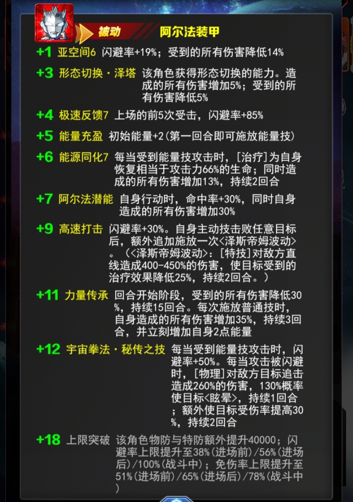 +12受到能量技能叠闪避,还是永久叠加的十五回合,这张卡闪避率也非常的高了,被闪避追击,意义不大打闪避只能靠大招二段但是伤害还是足的