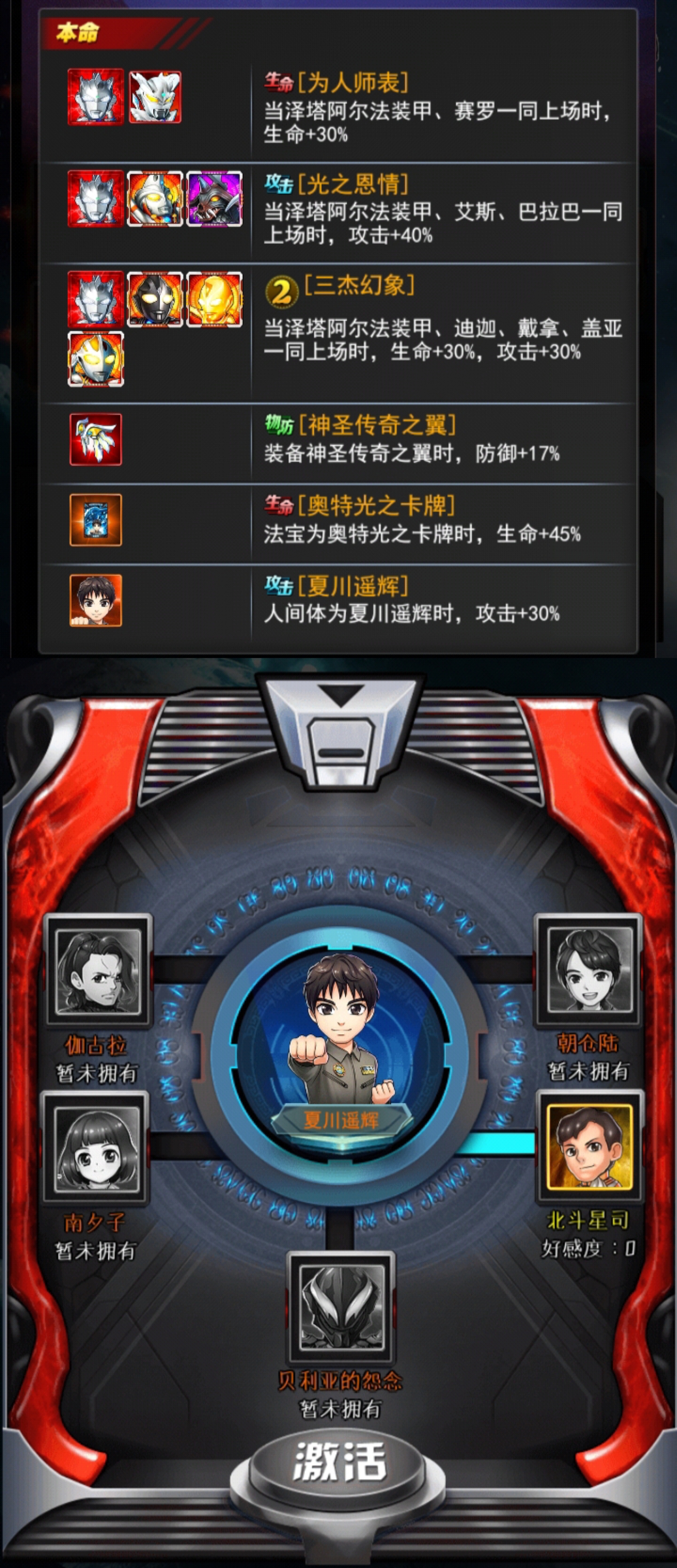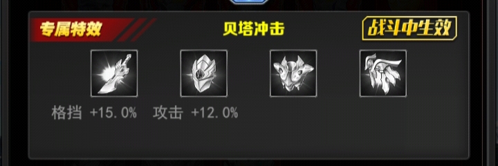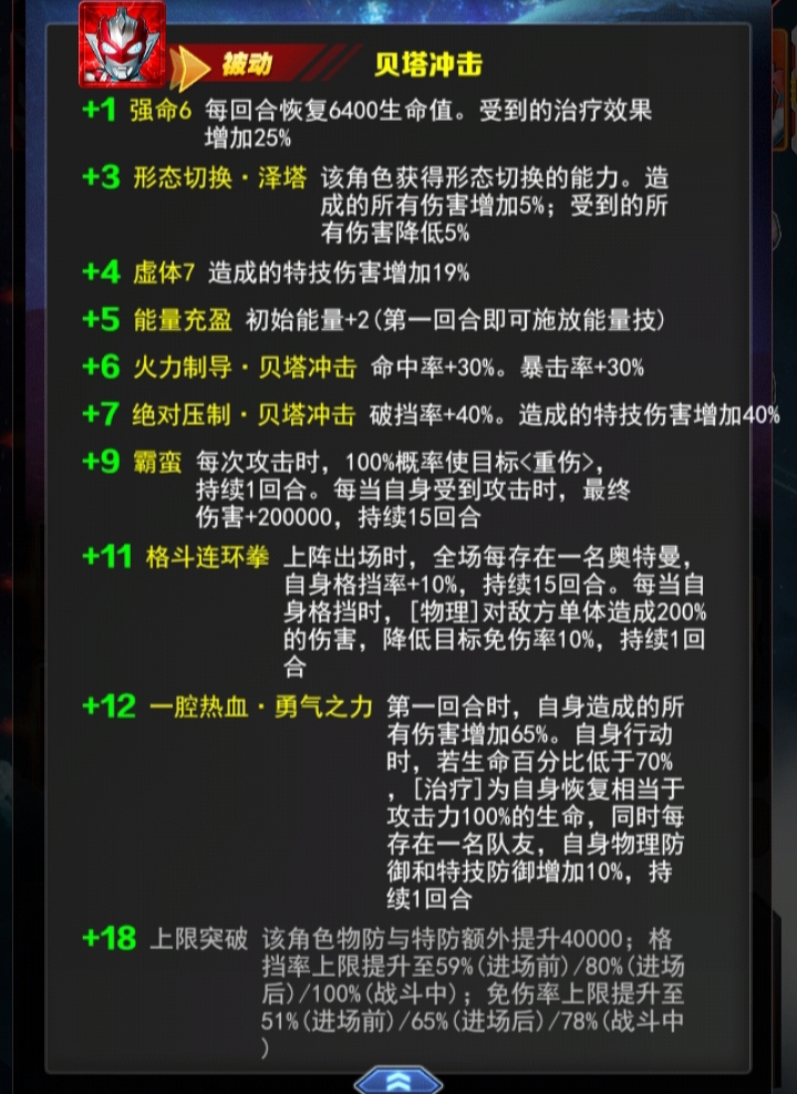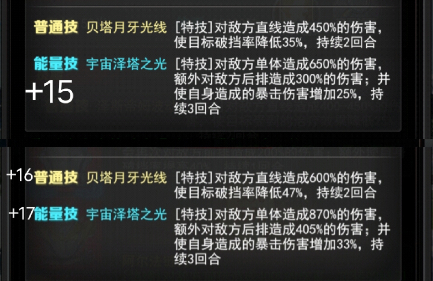 +15能量技: 宇宙泽塔之光[特技]对敌方单体造成650%的伤害, 额外对敌方后排造成300%的伤害;并使自身造成的暴击伤害增加25%,持续3回合