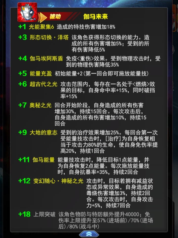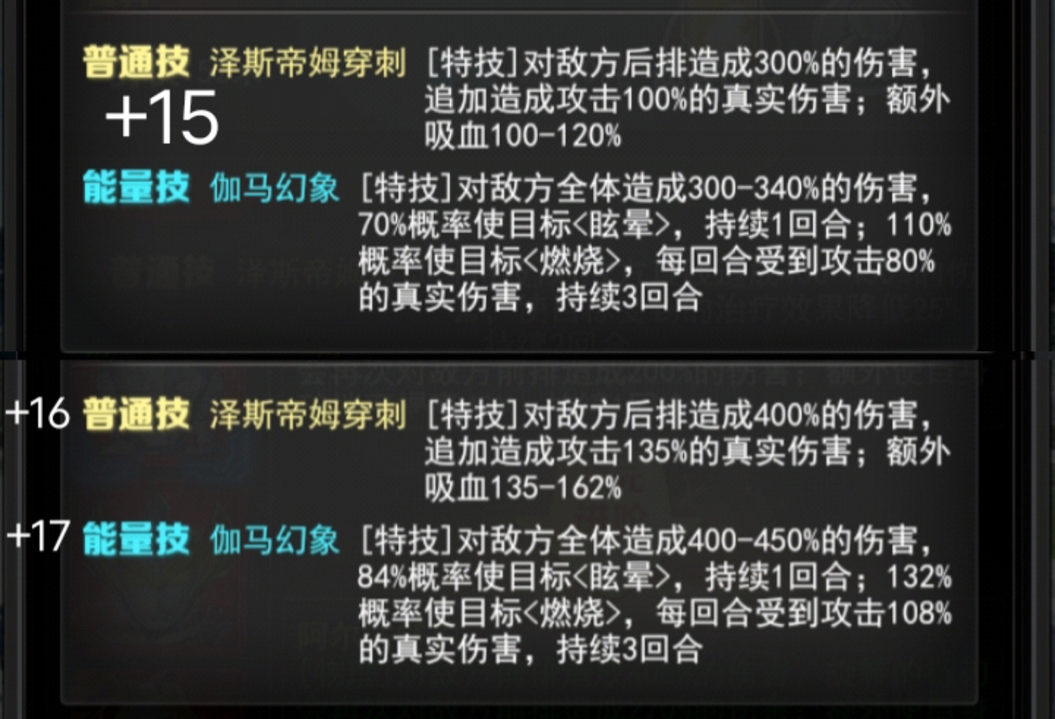+17能量技 伽马幻象[特技]对敌方全体造成400-450%的伤害,84%概率使目标<眩晕>,持续1回合;132%概率使目标<燃烧>,每回合受到攻击108%的真实伤害,持续3回合