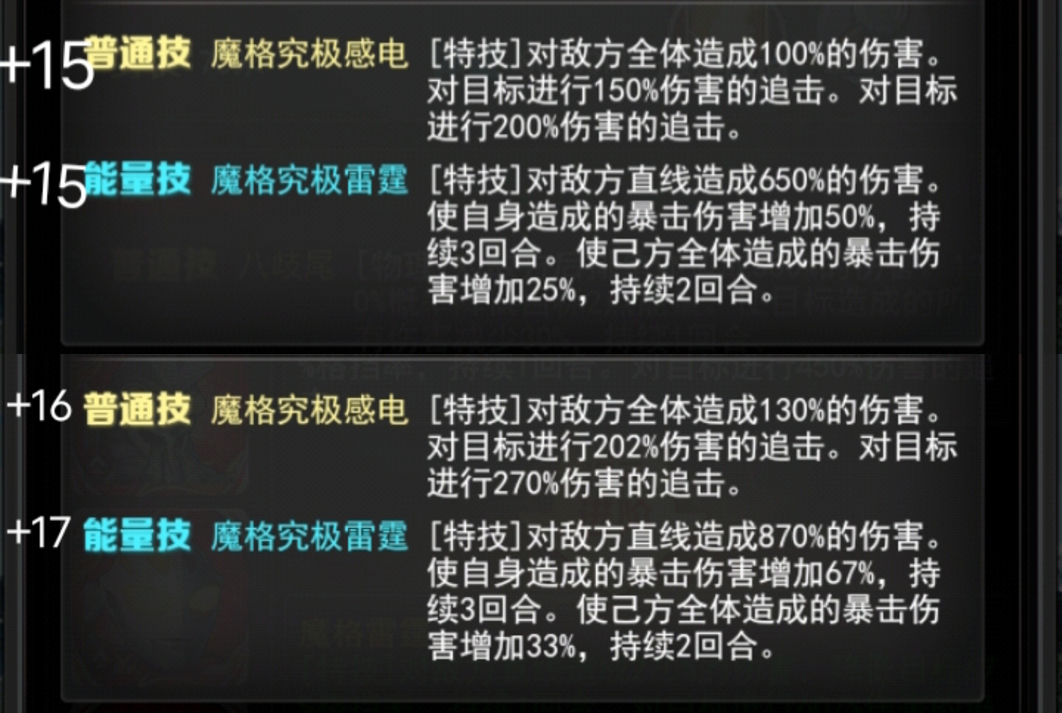 +17 能量技 魔格究极雷霆[特技]对敌方直线造成870%的伤害。使自身造成的暴击伤害增加67%,持续3回合。使己方全体造成的暴击伤