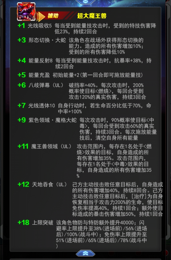 +15能量技 魔格究极雷霆[特技]对敌方直线造成650%的伤害。使自身造成的暴击伤害增加50%,持续3回合。使己方全体造成的暴击伤害增加25%,持续2回合。
