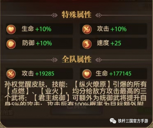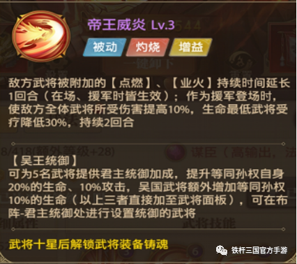 该技能也是孙权的被动技能,敌方武将身上附加【点燃】、【业火】持续时间延长1个回合(无论是上场还是做援军都可以生效);作为援军时,能使敌方全体武将收到的伤害提高10%,生命最低的武将受疗降低30%,持续2回合。