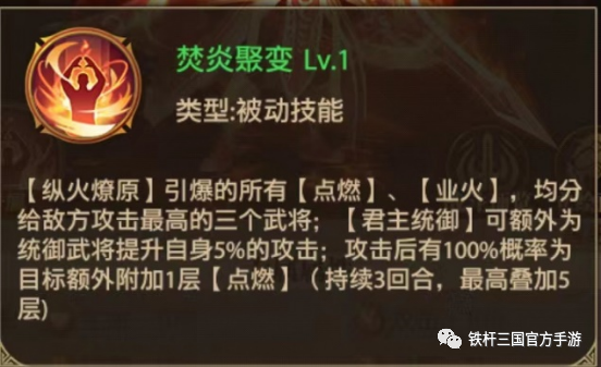 焚炎聚变:【纵火燎原】引爆所有【点燃】、【业火】,均分给敌方攻击最高的三个武将;【君主统御】可额外为统御武将提升自身5%的攻击,攻击后有100%概率为目标额附加1层【点燃】(持续3回合。最高叠5层)