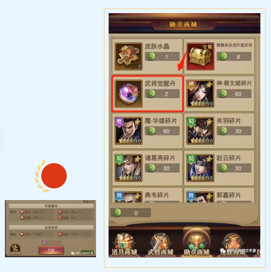 在武将觉醒界面需消耗觉醒丹进行皮肤升级,觉醒皮肤满级是5级,每升一级需消耗50个武将觉醒丹;觉醒丹可通过勋章商场兑换获取。