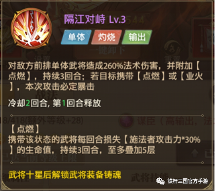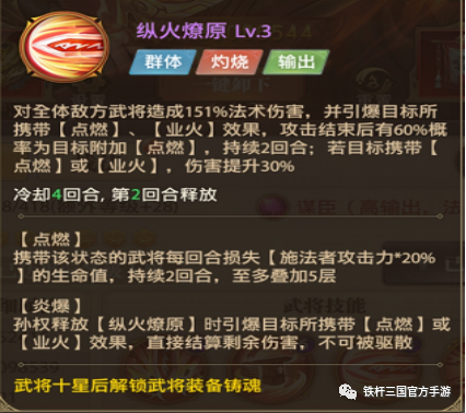 该技能是一个单体输出,并带有灼烧的效果,能够对敌方的前排造成260%的法术伤害,附加点燃持续3个回合;如果目标武将身上带有【点燃】或者【业火】必定触发暴击伤害。