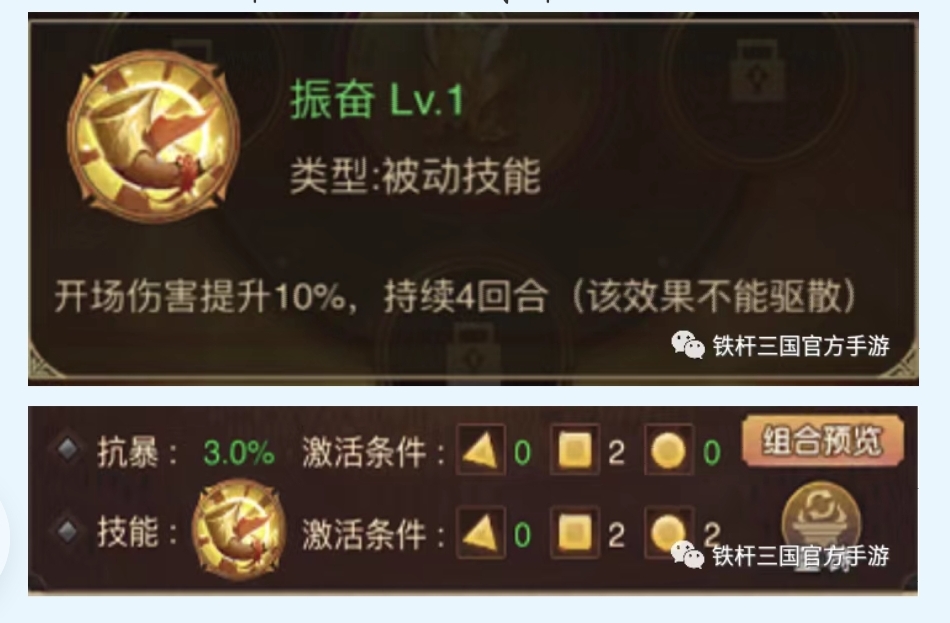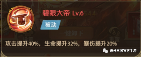该技能是孙权的被动技能,能够提升自身40%攻击,32%生命与20%暴伤。