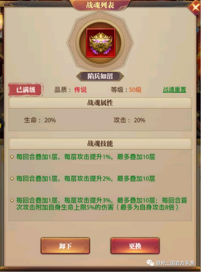 推荐战魂为陷兵如沼,传说级别的战魂大大提高了孙权自身的基础生命与攻击属性。