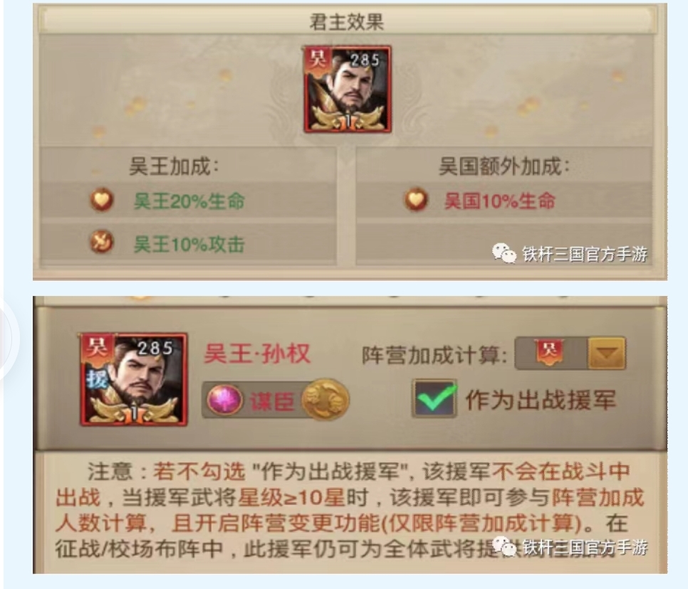 孙权作为君主,可谓适合搭配各阵容,用作君主时不同阵营的武将都有君主加成并且在10星后吴王的阵营可以随之变换;君主加成可以给统御模块内的武将提供同等孙权20%的生命和15%的攻击;吴国武将可以额外获得10%的生命加成。