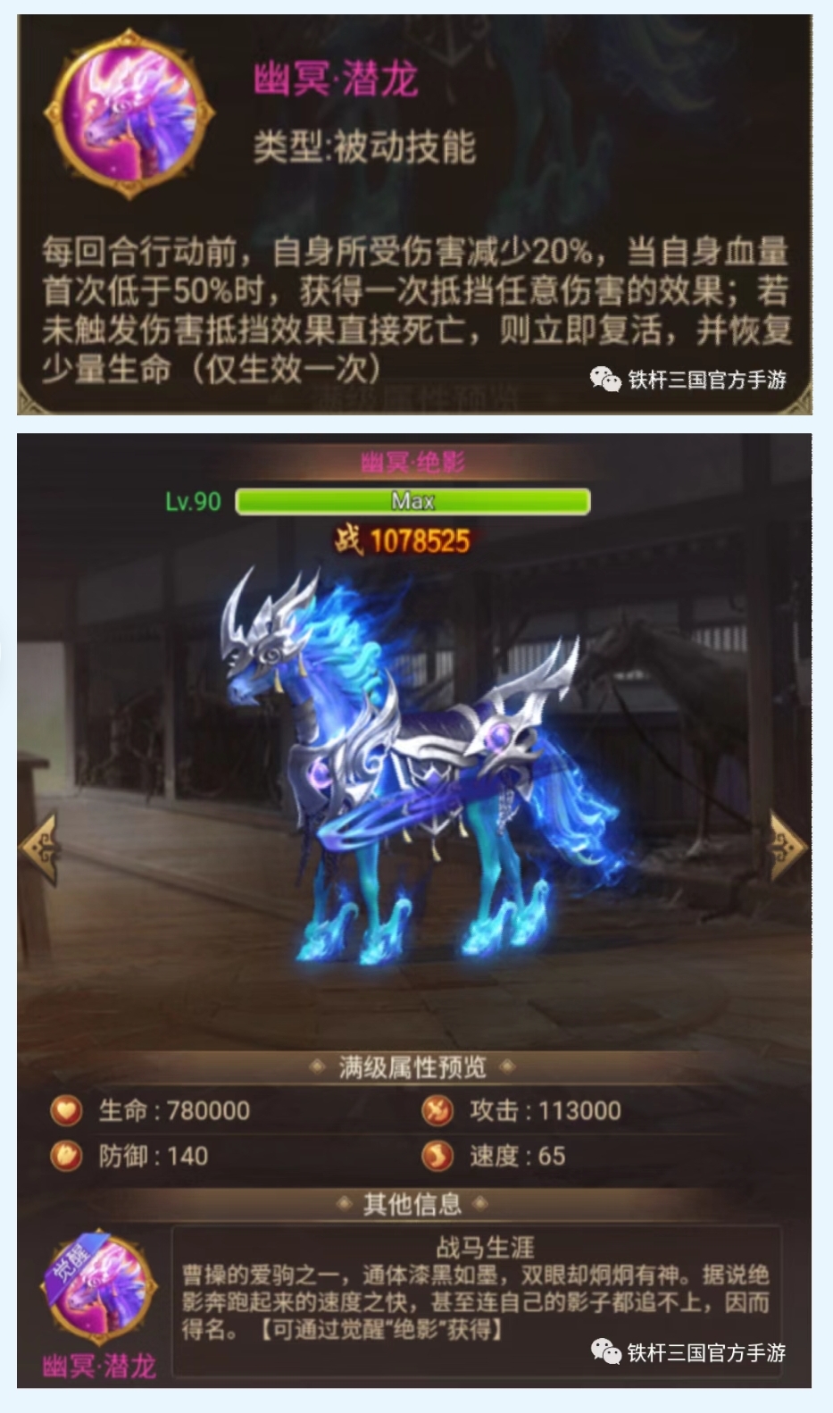 燃烧流的核心伤害【点燃】和【业火】,而孙权的技能【纵火燎原】能提前结算敌方所有武将身上的【点燃】和【业火】,所以要提升孙权的生存能力。而战马幽冥绝影是战马中最能提升单体武将生存能力的战马。不仅自带20%的减伤,且在血量首次低于50%时,会获得一次伤害抵挡,如果没有触发改抵挡直接被秒杀的话还能获得一次复活。