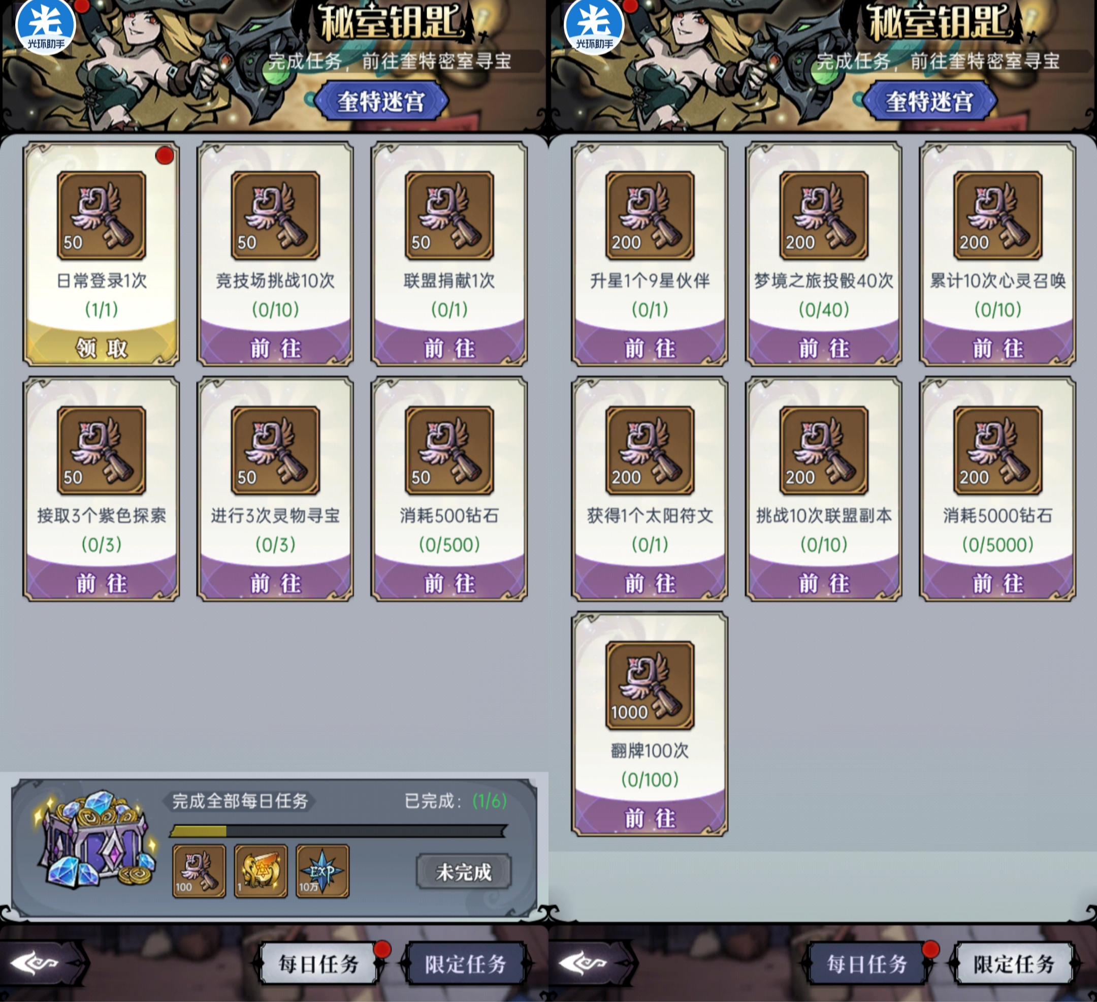 每日挑战任务和挑战奖励要尽可能完成,有不俗的钥匙奖励