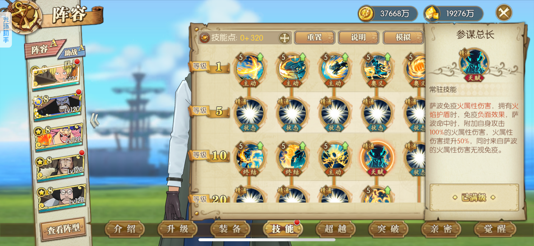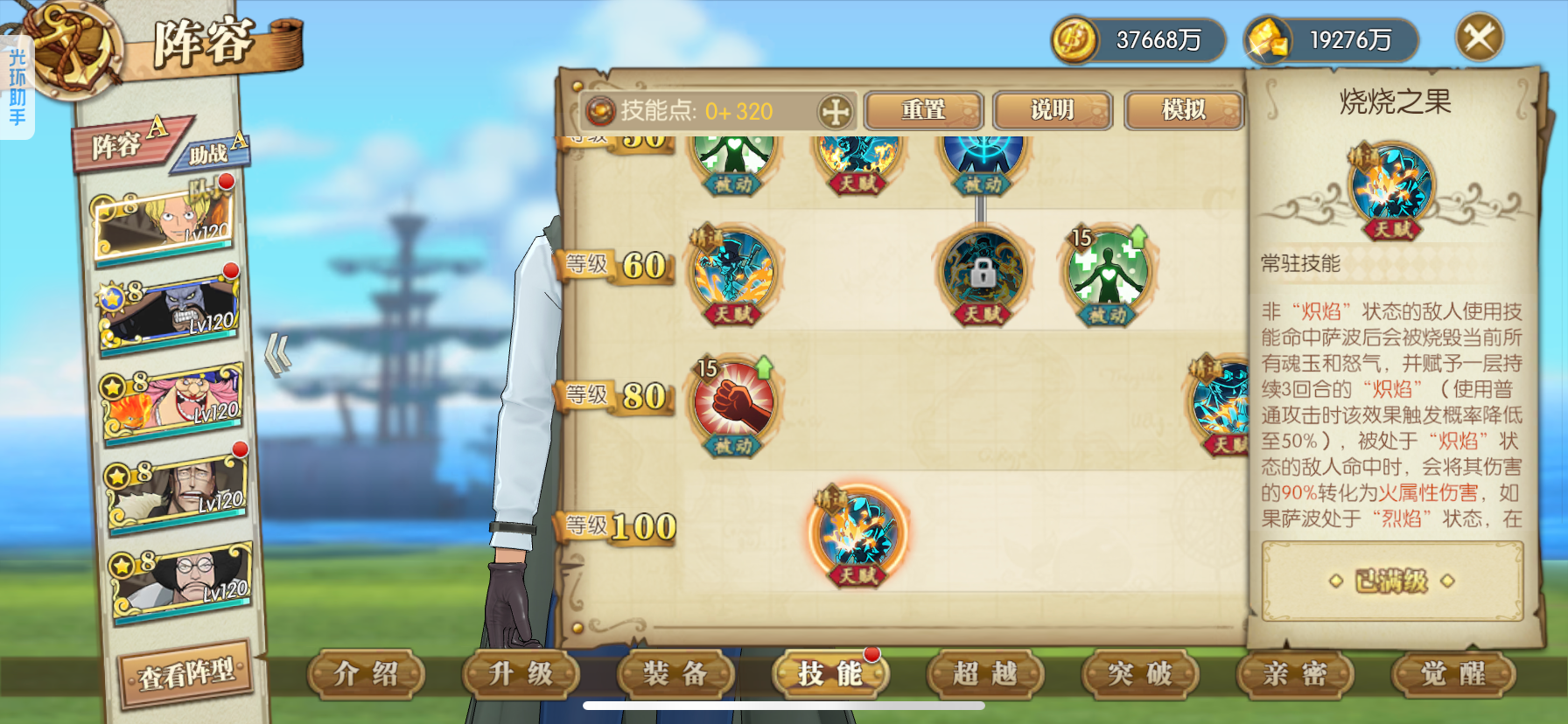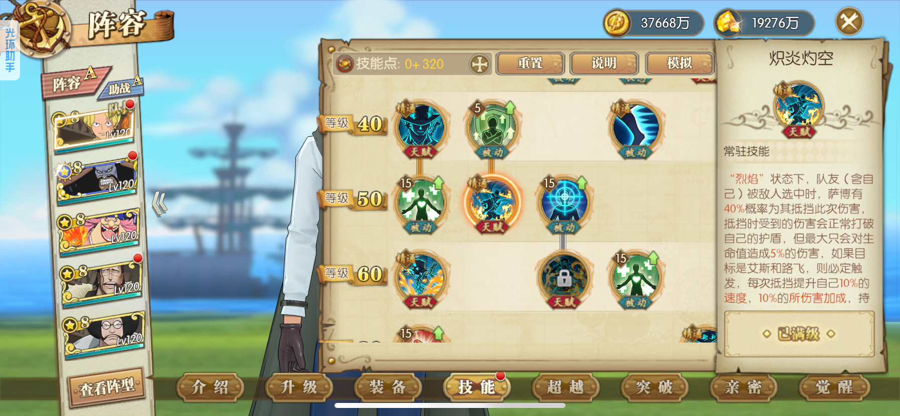 “烈焰”状态下,队友(含自己)被敌人选中时,萨波有一定百分比概率为其抵挡此次伤害,抵挡时受到的伤害会正常打破自己的护盾,但最大只会对生命值造成一定百分比的伤害,如果目标是艾斯和路飞,则必定触发抵挡,每次抵挡提升自己一定百分比的速度、一定百分比的所伤害加成,持续1次行动,触发抵挡时不会被移除。