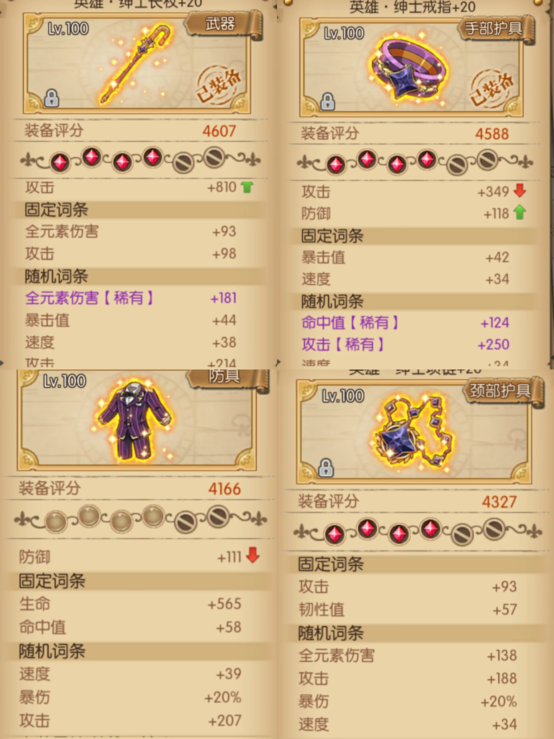 普通装备的优势:装备词条属性高(以百级绅士套为例,如下图所示,一套装备就加了2200点攻击力),而且套装属性对伤害有加成。