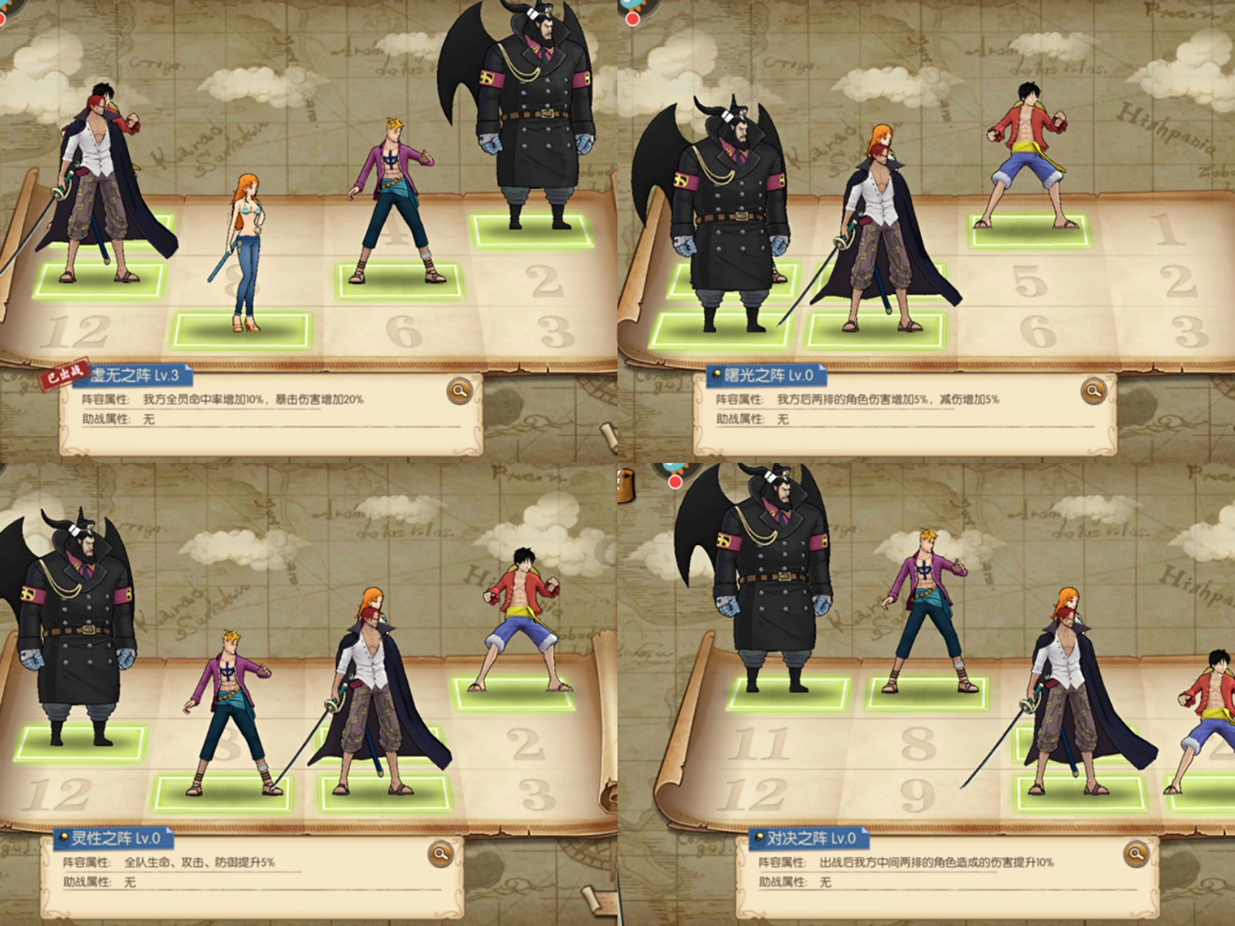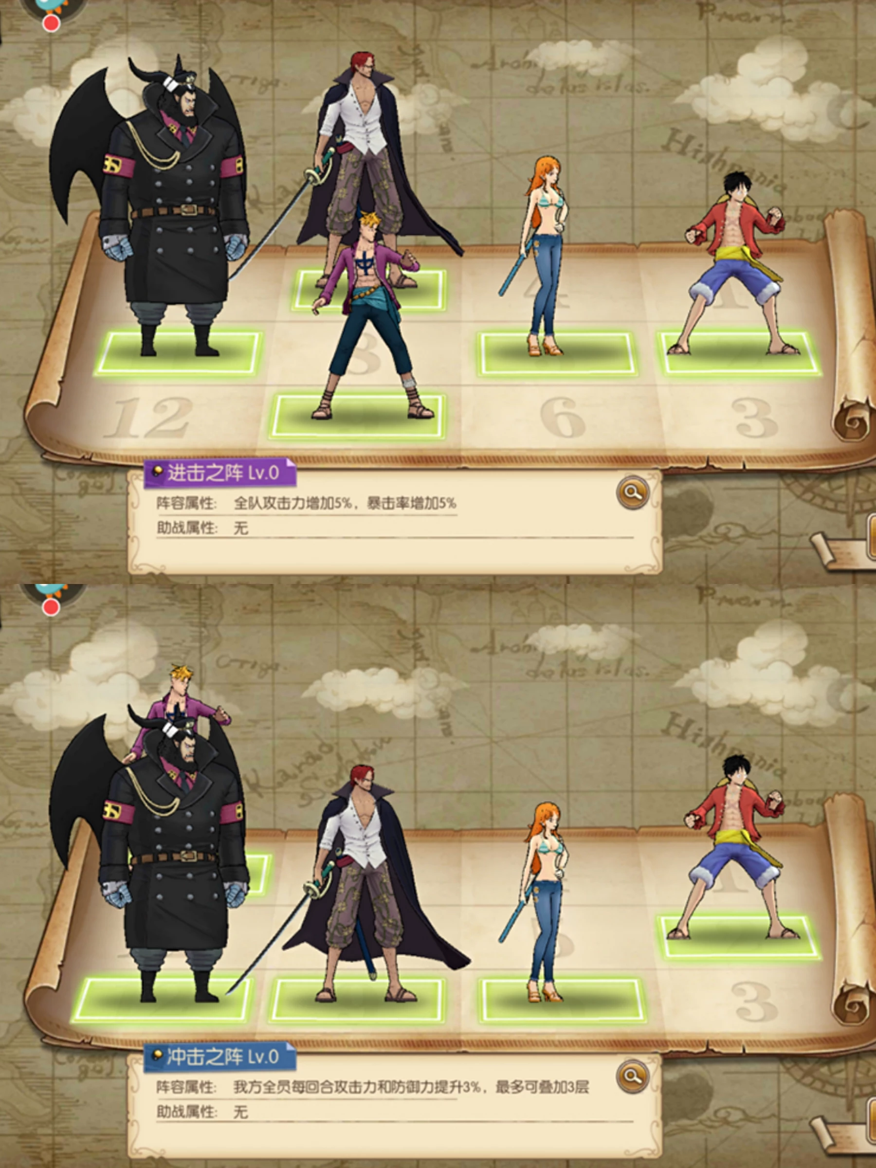 阵型优先选择:进击之阵&冲击之阵,四个助战位,属性也很好用。