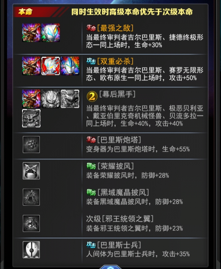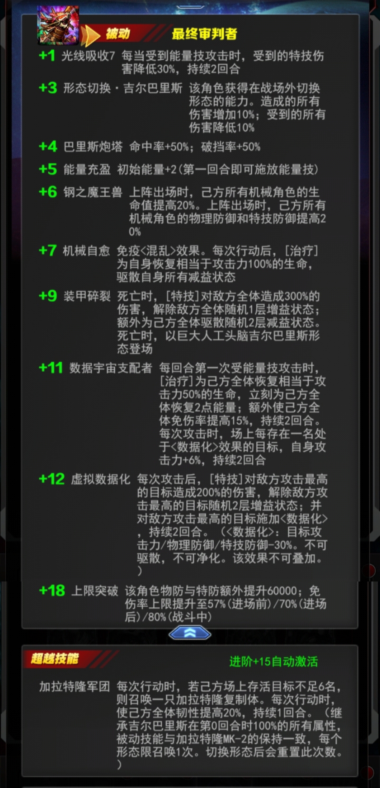 +15超越技:核心被动,每个形态在阵容有空位置情况下可召唤白龙,继承黑龙进场属性无被动技能,但法宝和变身器圣物均有效。有献祭效果也有一定输出辅助性。
