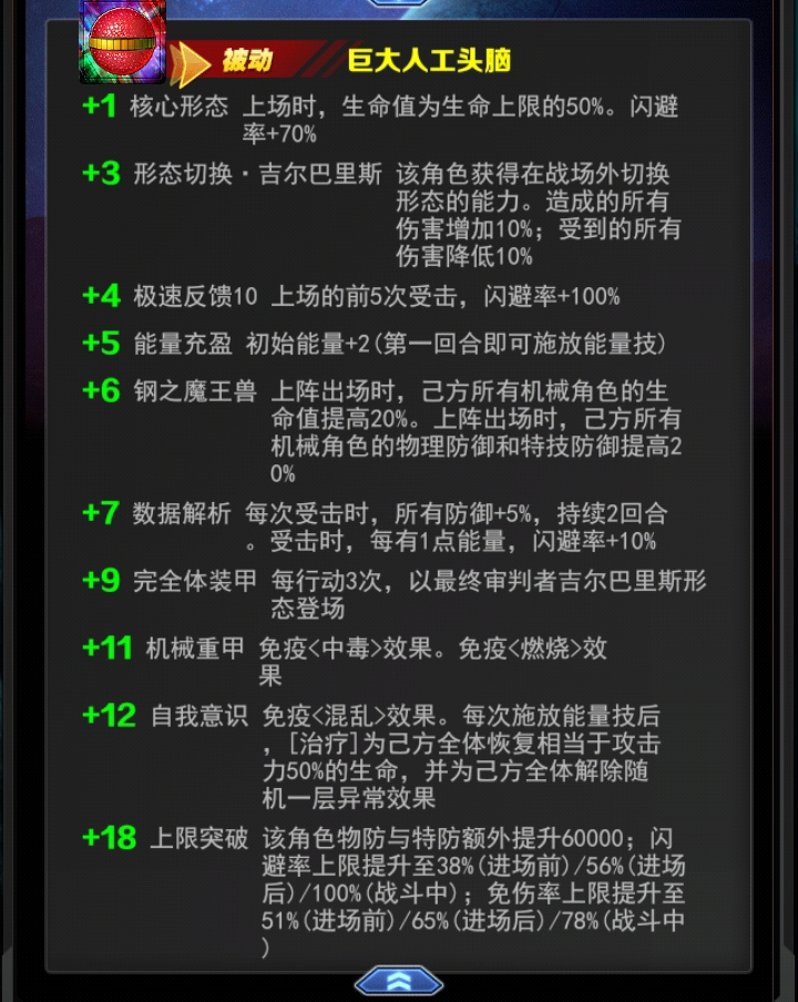 +17能量技 数据重置[治疗]为自身恢复相当于攻击力200%的生命,使目标闪避率提高40%,持续2回合;并立刻为自身恢复2点能量