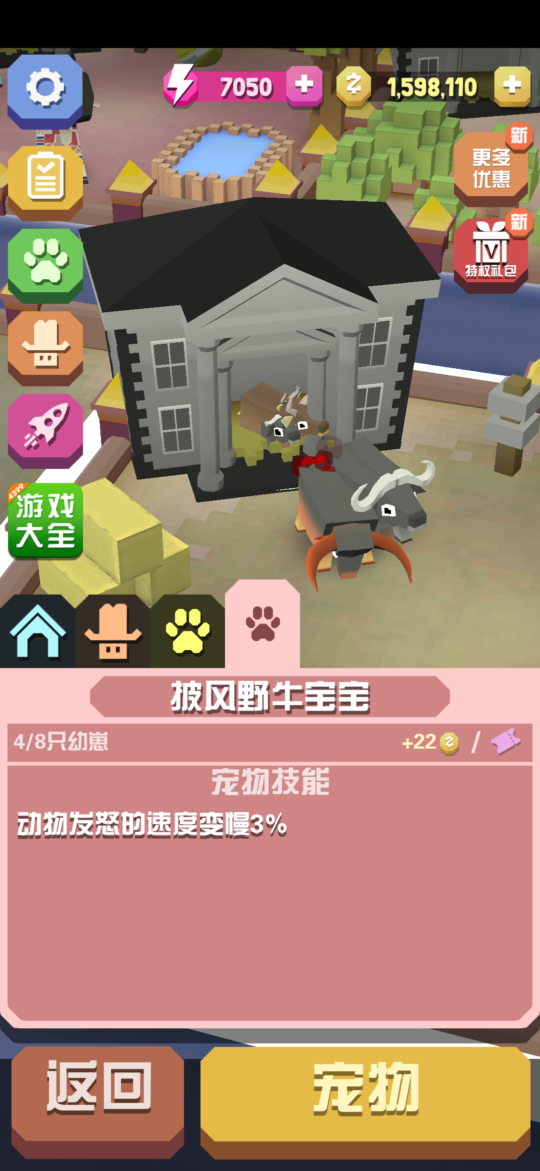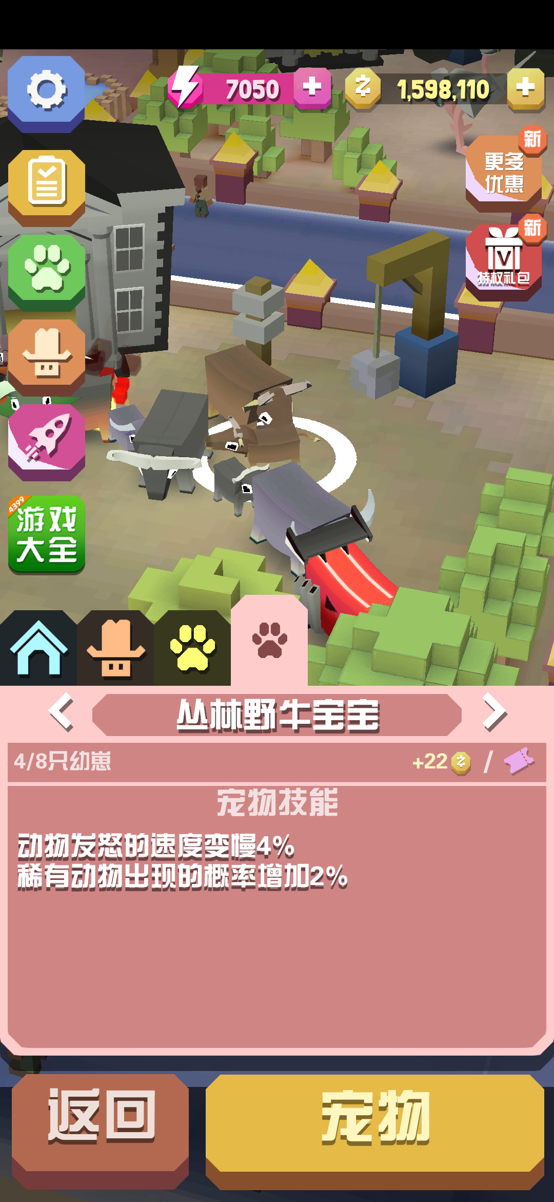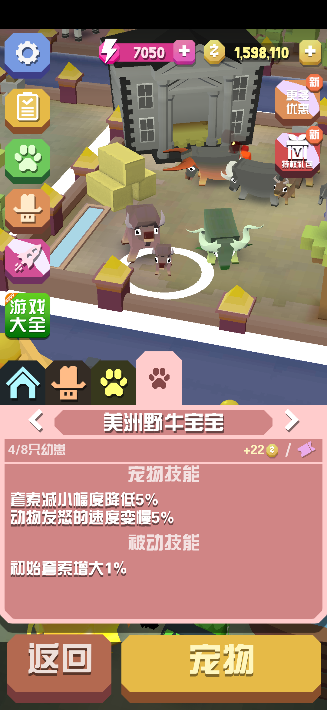 第四头野牛,美洲野牛的宝宝的技能是动物发怒的速度变慢5%,套索减小幅度降低5%,他还有一个被动技能是初始套锁增加1%。他这个技能量有点大呀,动物发怒速度变慢的量也增加了,玩家在每一次换乘的时候,套索都会减小,那就意味着玩家从动物身上跳出去之后落地的风险变大,所以说,这技能对玩家来说也是有很大帮助的。第五头野牛卷发野牛的技能是动物伴侣出现概率增加8%,驯服动物伴侣时间缩短5%,动物发怒的速度变慢5%。如果玩家携带这个宠物的话,对于玩家获得宠物也有很大的帮助。