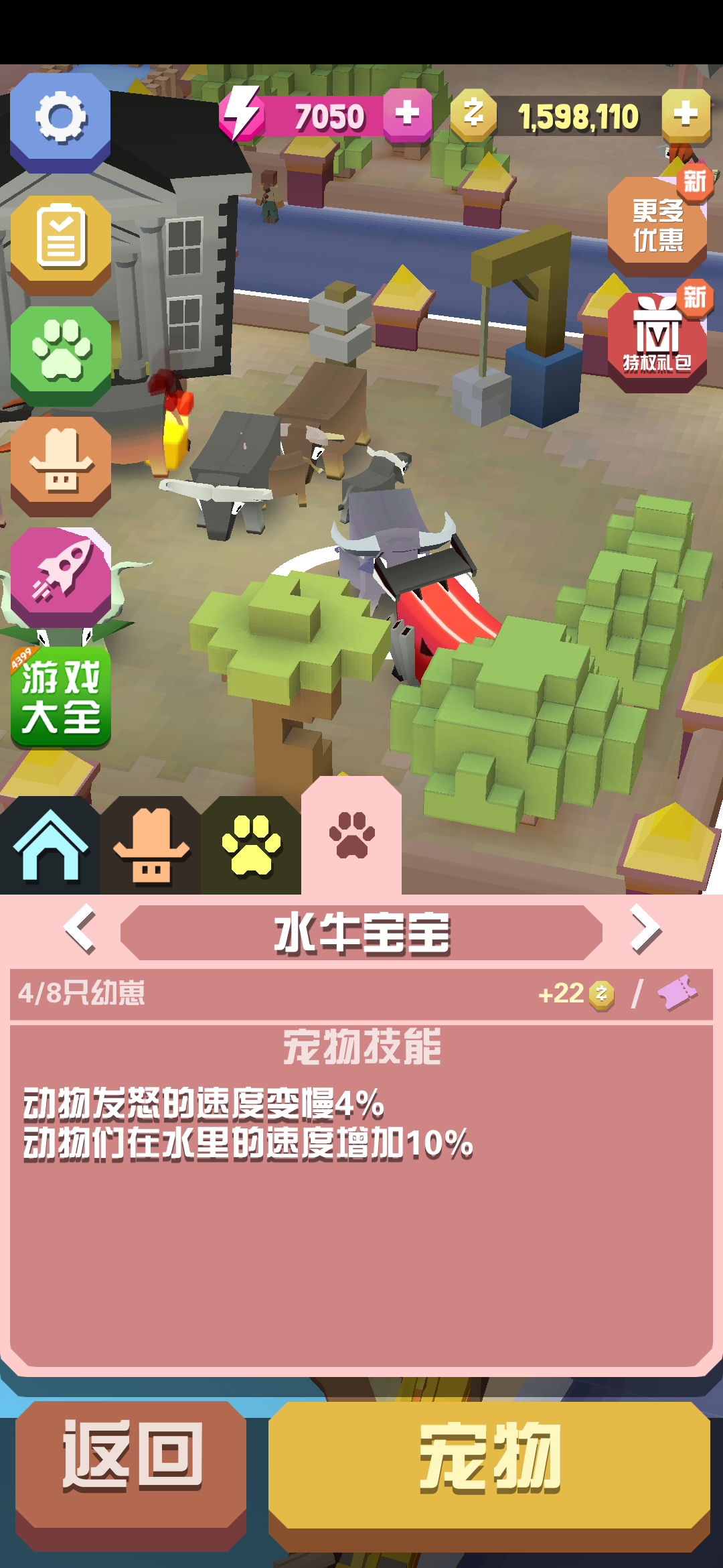 那么同理,第二个丛林野牛的宝宝技能是动物发怒的速度变慢4%,还有稀有动物出现的概率增加2%。增加稀有动物出现的概率,这个确实是比较有用的。无论是为了获得稀有动物,还是跟稀有动物配对生宝宝。第三个水牛的宝宝的技能是动物发怒的速度变慢4%和动物们在水里的速度增加10%,因为在吸收草原地图中会出现瀑布这么一个场景,瀑布会流成一条河,在河里面动物的速度会变慢,不过这个速度会变慢也不一定都是坏处。