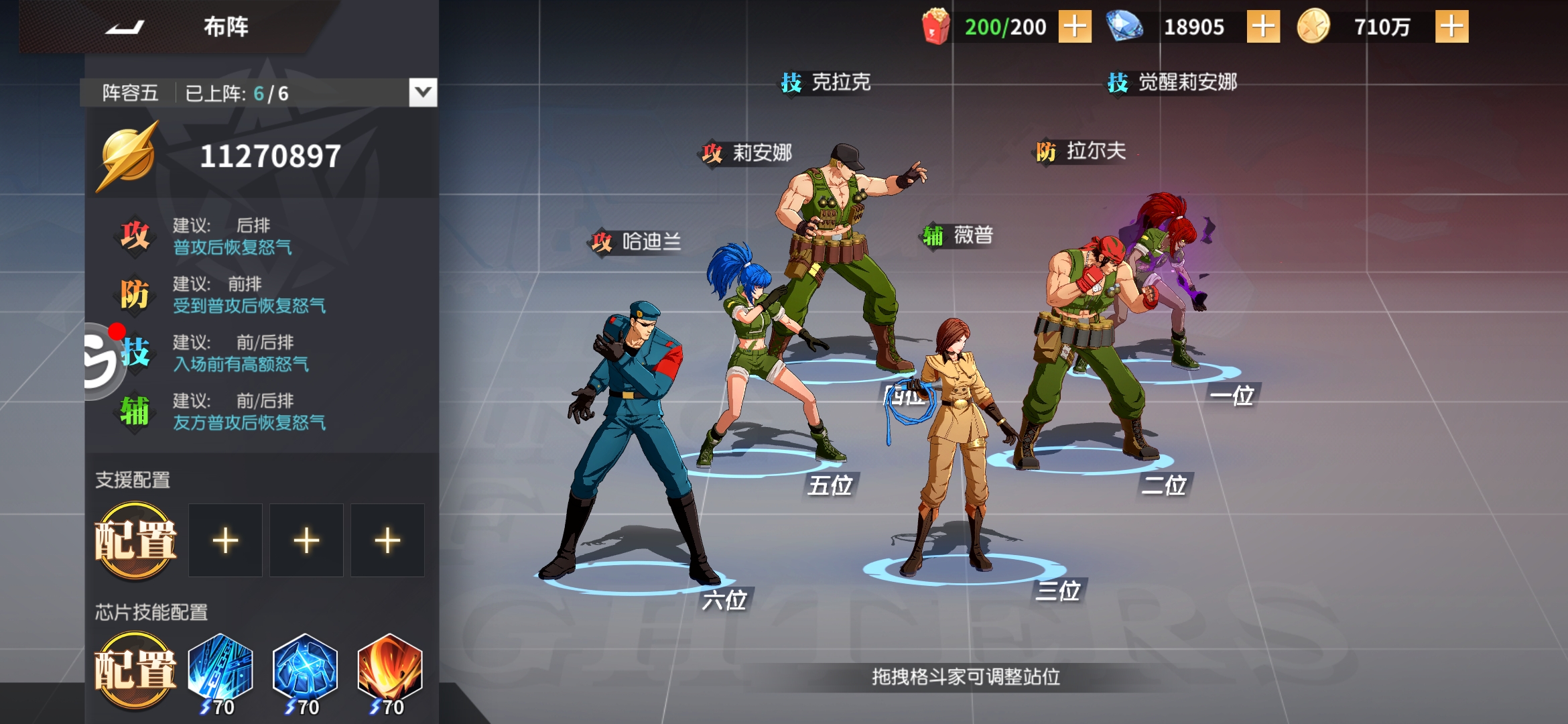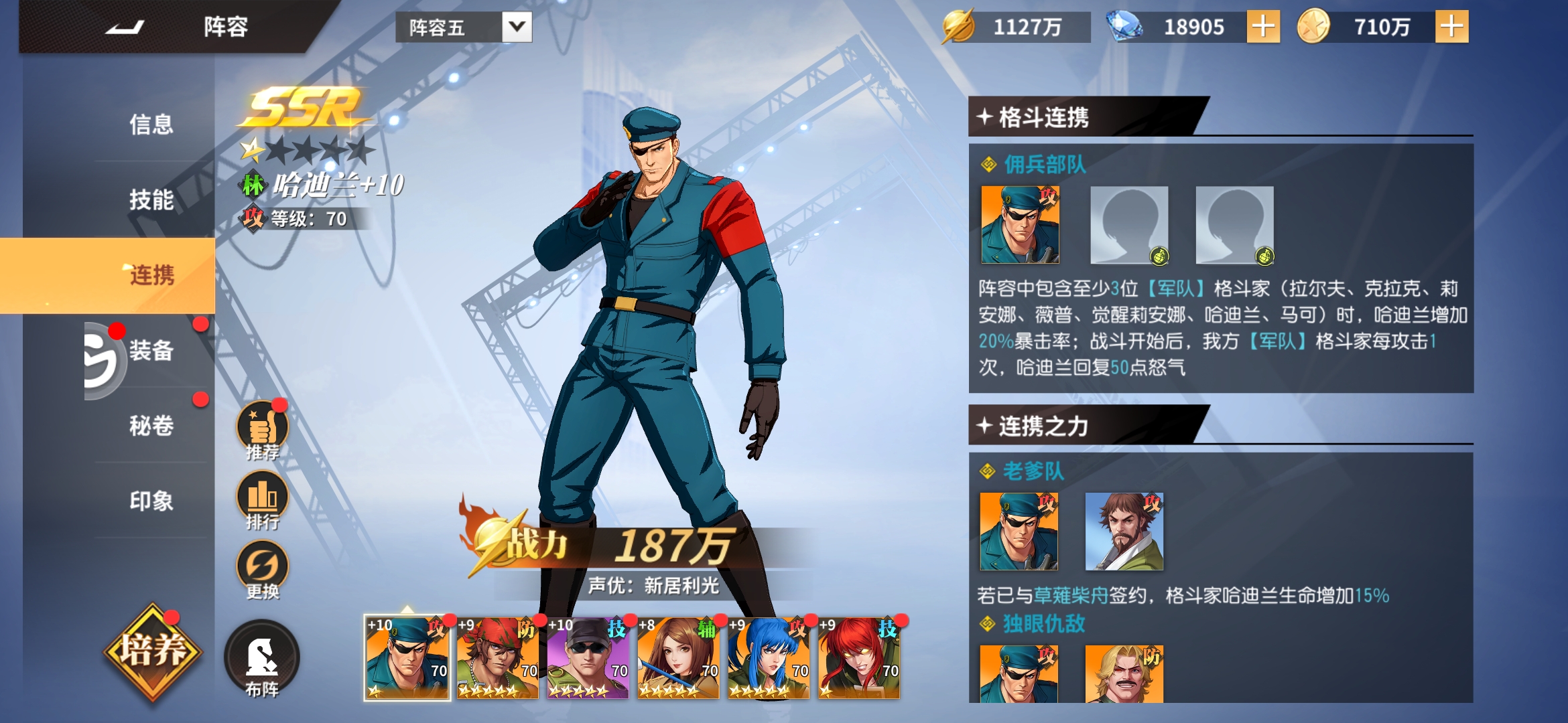 以哈迪兰为核心,根据哈迪兰的连携特性军队英雄每攻击1次,哈迪兰回50怒。那么最适合哈迪兰的队伍就是纯军队。