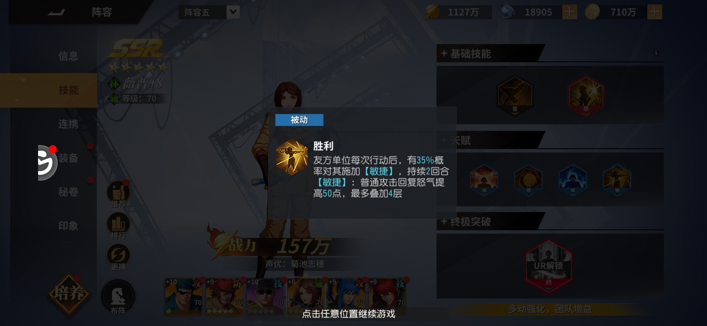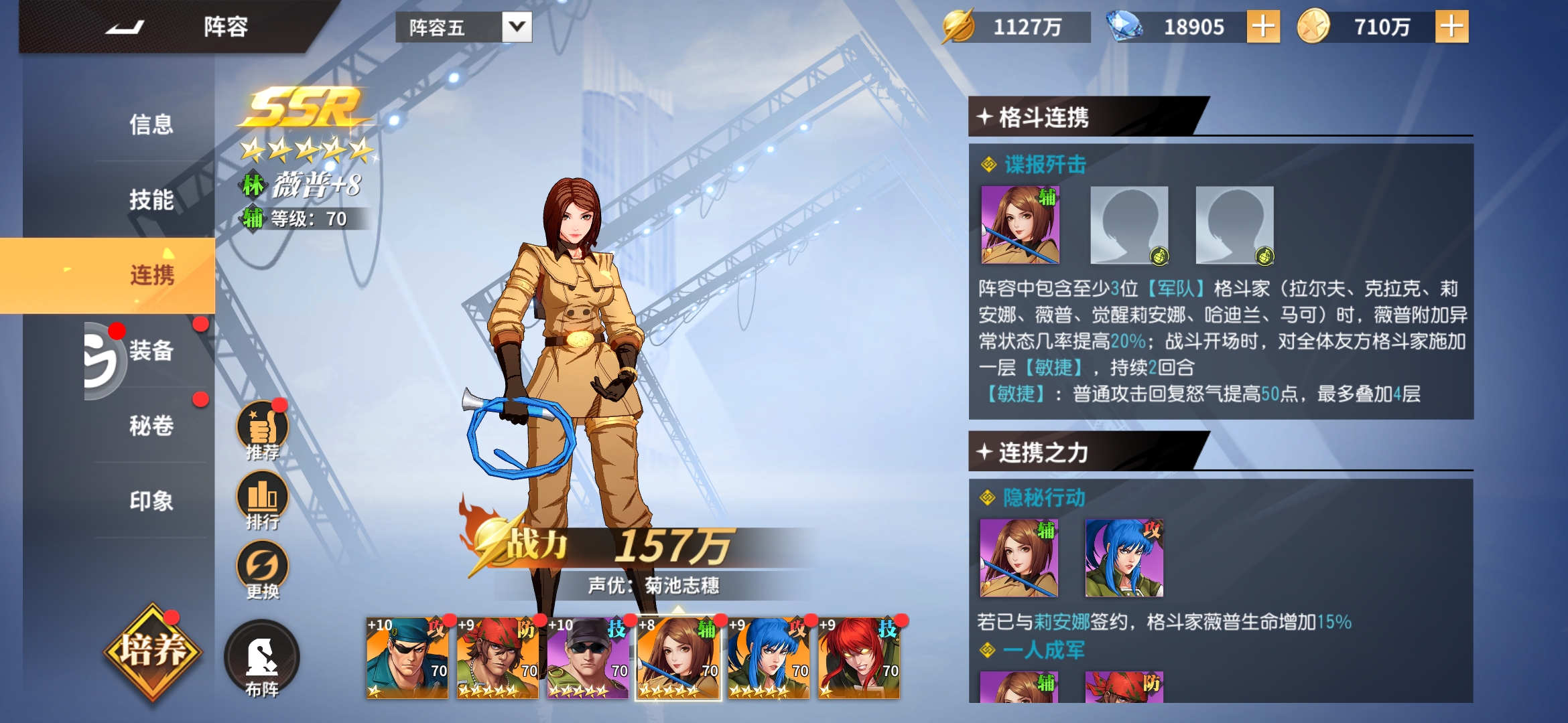 既然走纯军队那么第二个确定的英雄就是另一个军队核心薇普,薇普虽然只是SR卡,但是跟琼一样同样是一个体系的核心,开场给我方加敏捷,给敌方加迟缓,战斗中给我方加暴击,还能追击多动给哈迪兰回怒。