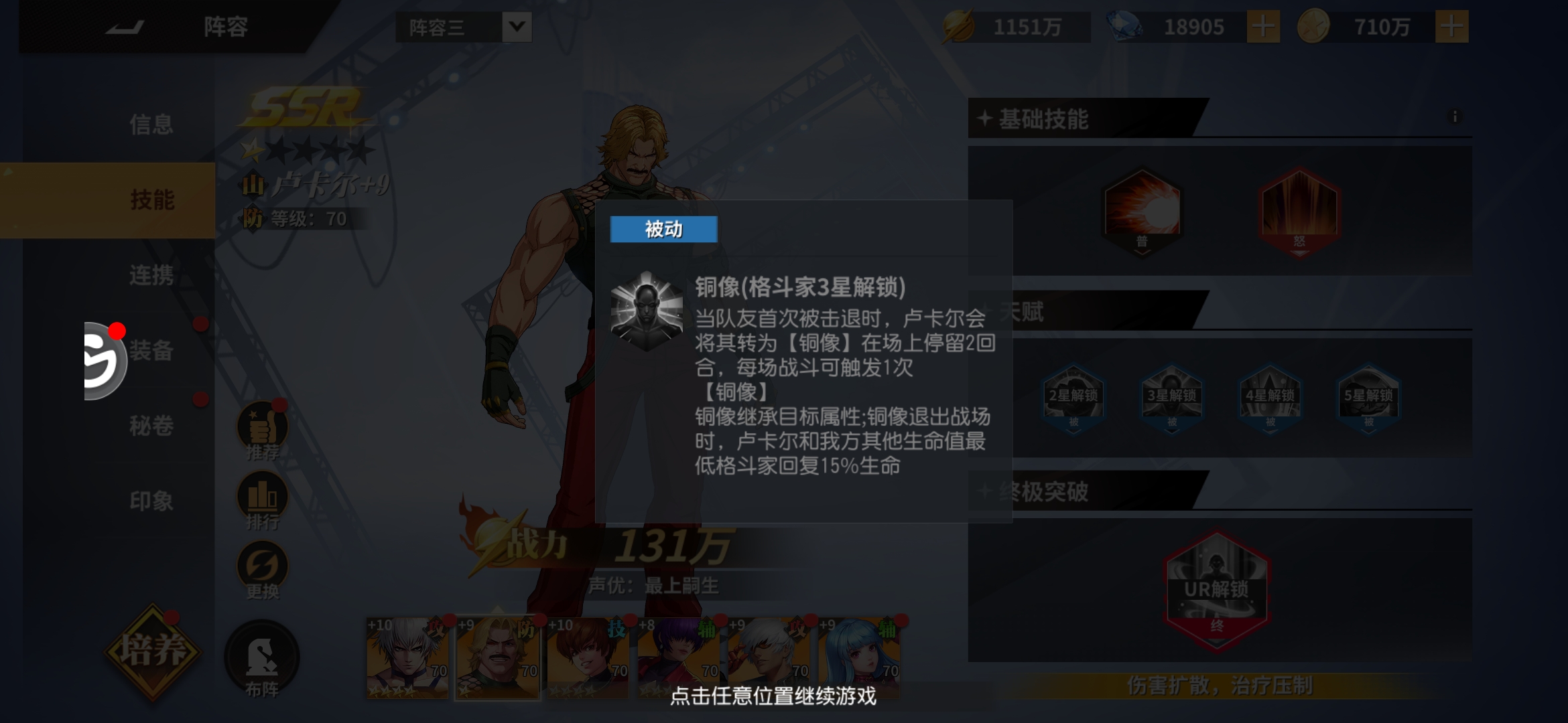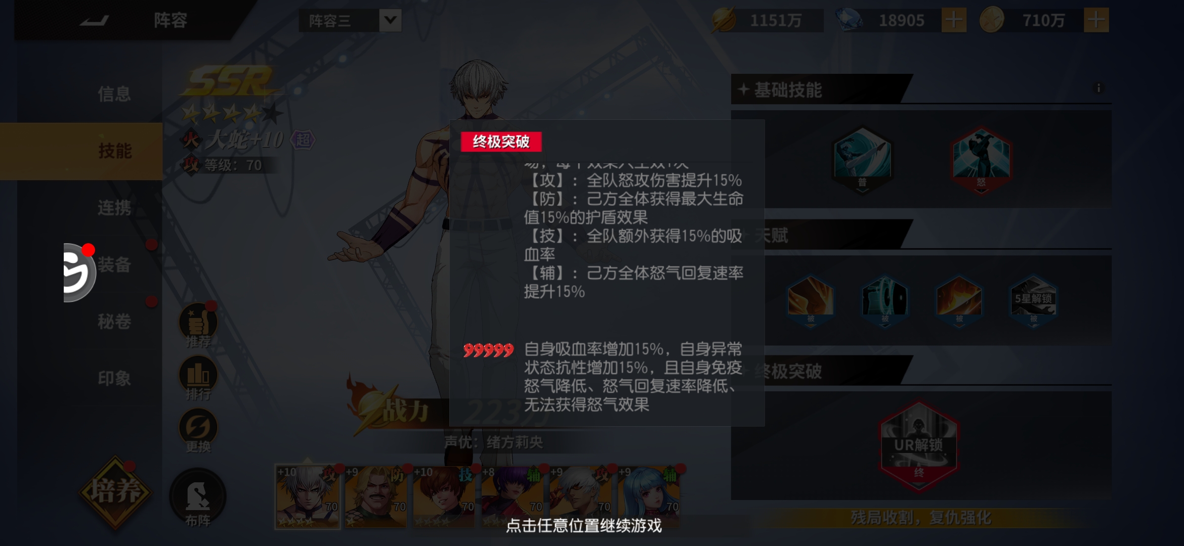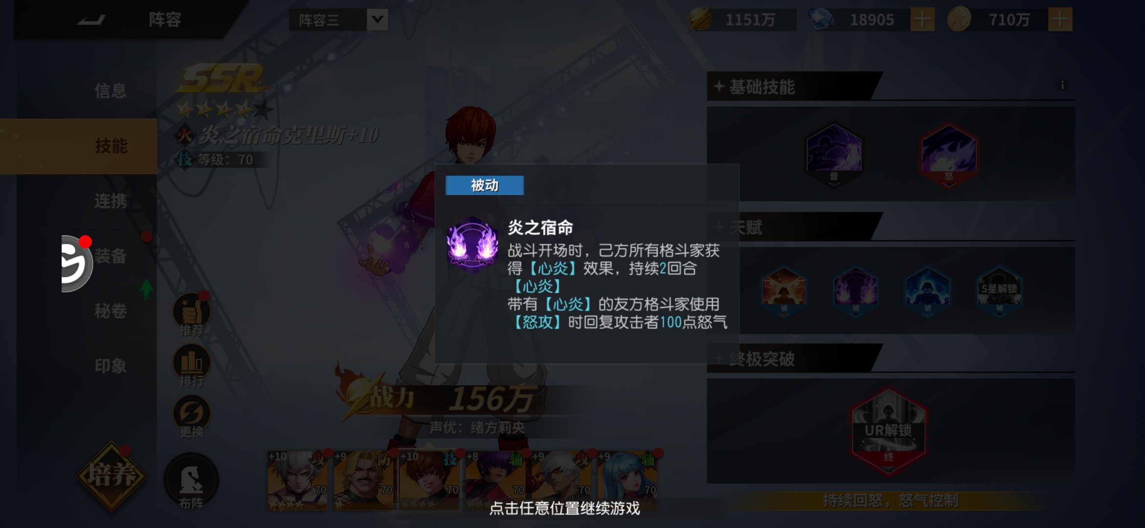 在克里斯献祭掉之后,全队会获得15%吸血,+攻卡潜能15%+攻卡突破15%=45%吸血。大蛇还有5火天赋再+15%吸血=60%吸血。这种情况下大蛇和K会化身两个残局战神通过超高吸血和卢卡尔+铜像提供的输出环境战胜对手。