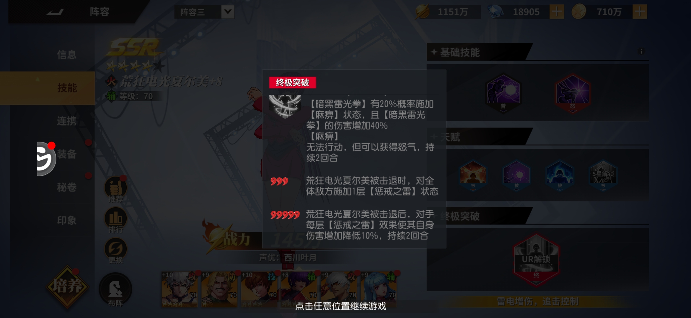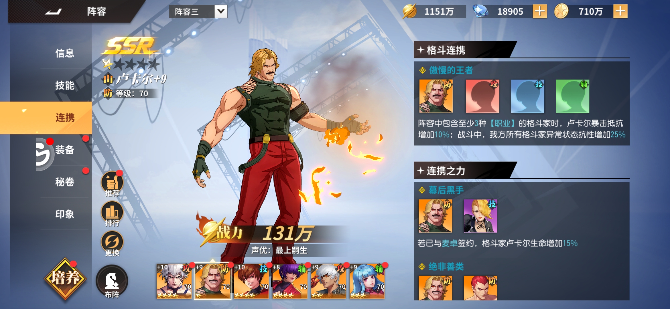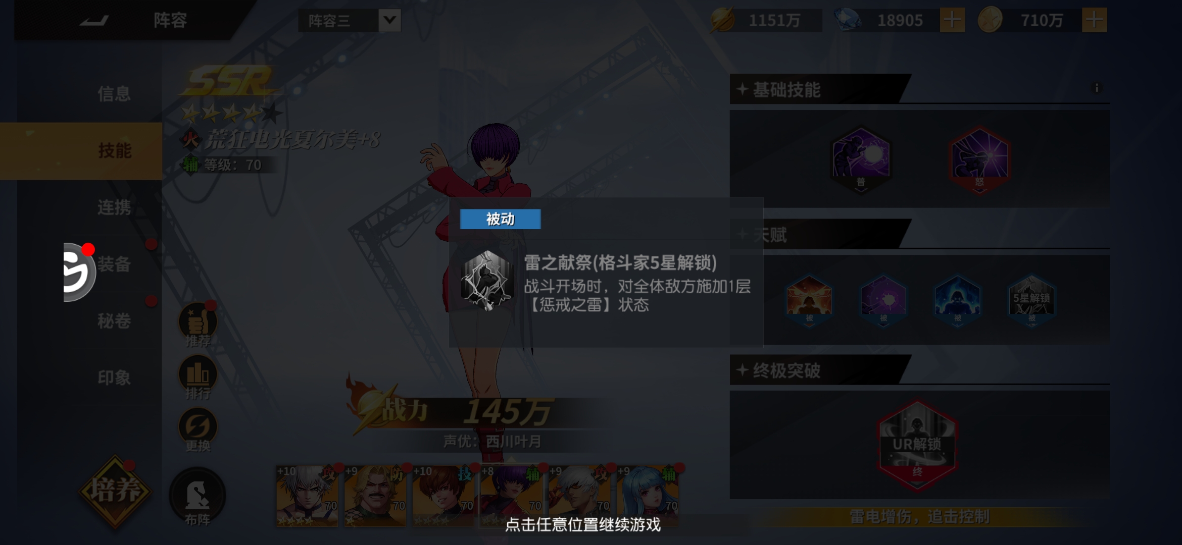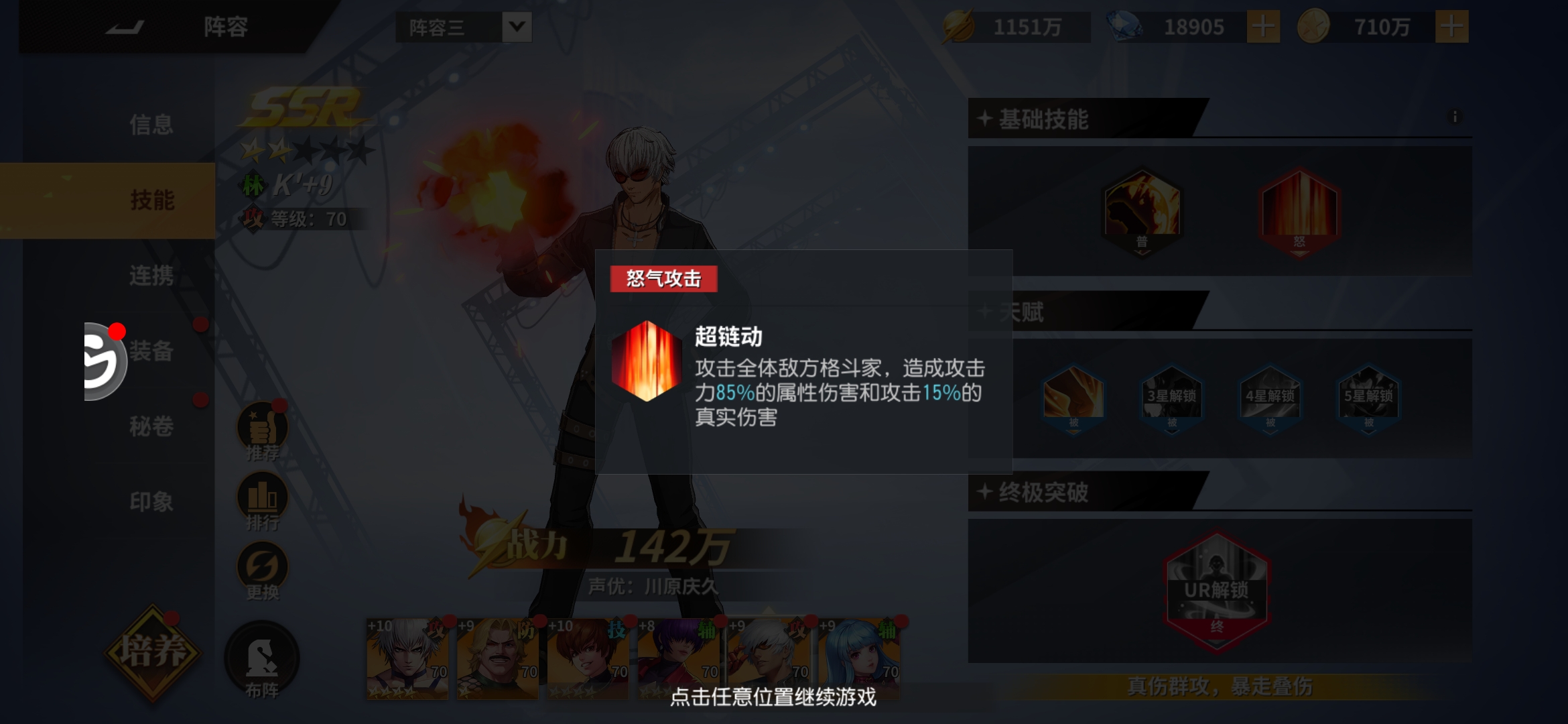 在克里斯献祭掉之后,全队会获得15%吸血,+攻卡潜能15%+攻卡突破15%=45%吸血。大蛇还有5火天赋再+15%吸血=60%吸血。这种情况下大蛇和K会化身两个残局战神通过超高吸血和卢卡尔+铜像提供的输出环境战胜对手。