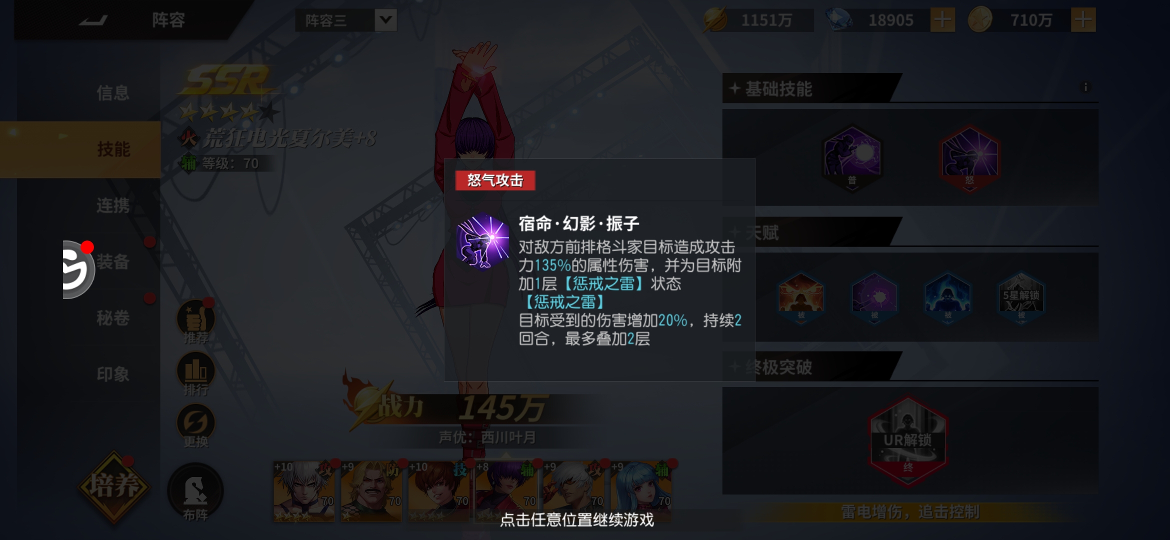 来为大蛇提供出手次数和全队+15%吸血效果。夏尔美也是同理,开场敌方全体挂1层【惩戒之雷】+20%被攻击增伤,死亡再全体挂1层【惩戒之雷】,如果死的够快就可以短时间内增伤40%。同时给大蛇提供出手次数和15%怒气回复。至此大蛇拥有自身连携20%+克里斯大招15%+大蛇3火辅助献祭15%=50%的超高怒气回复,为自己高频率开大提供怒气支持。