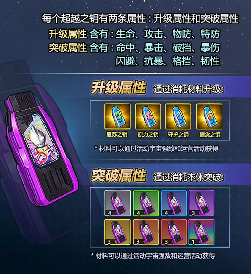 进行【品质突破】后会改变钥匙的底色和品质,突破会消耗同品质本体(例:3*紫色特利迦复合型钥匙=1*黄色特利迦复合型钥匙)