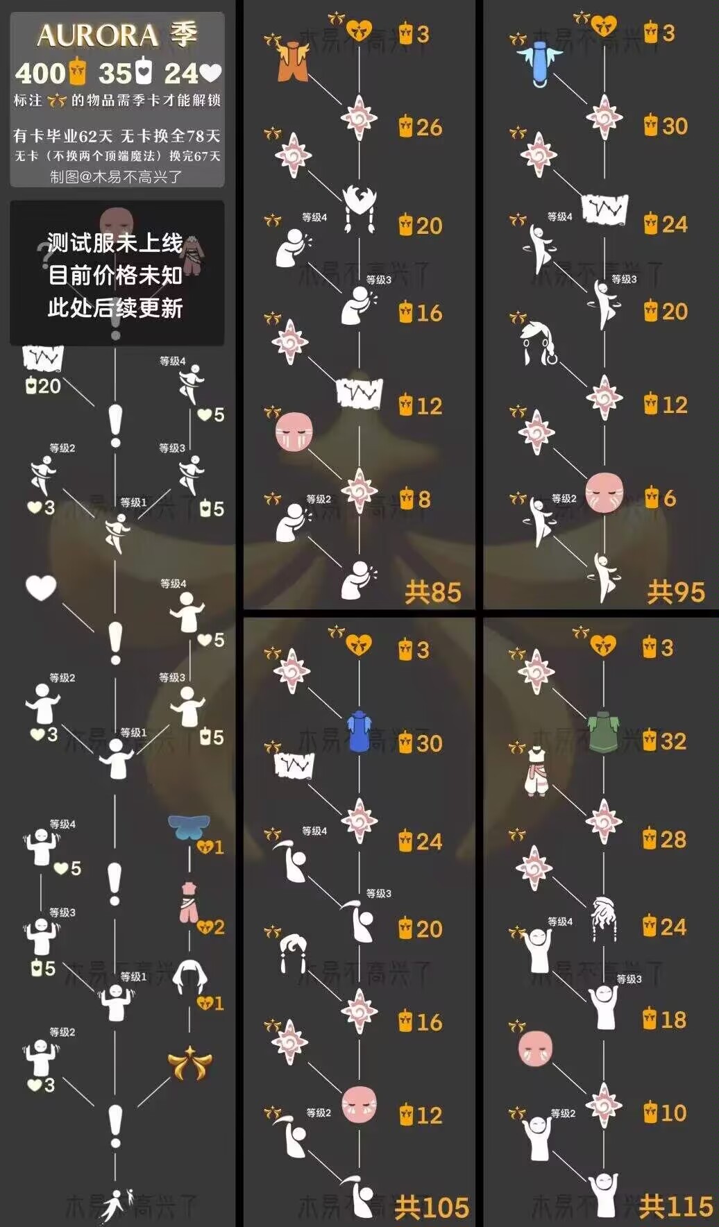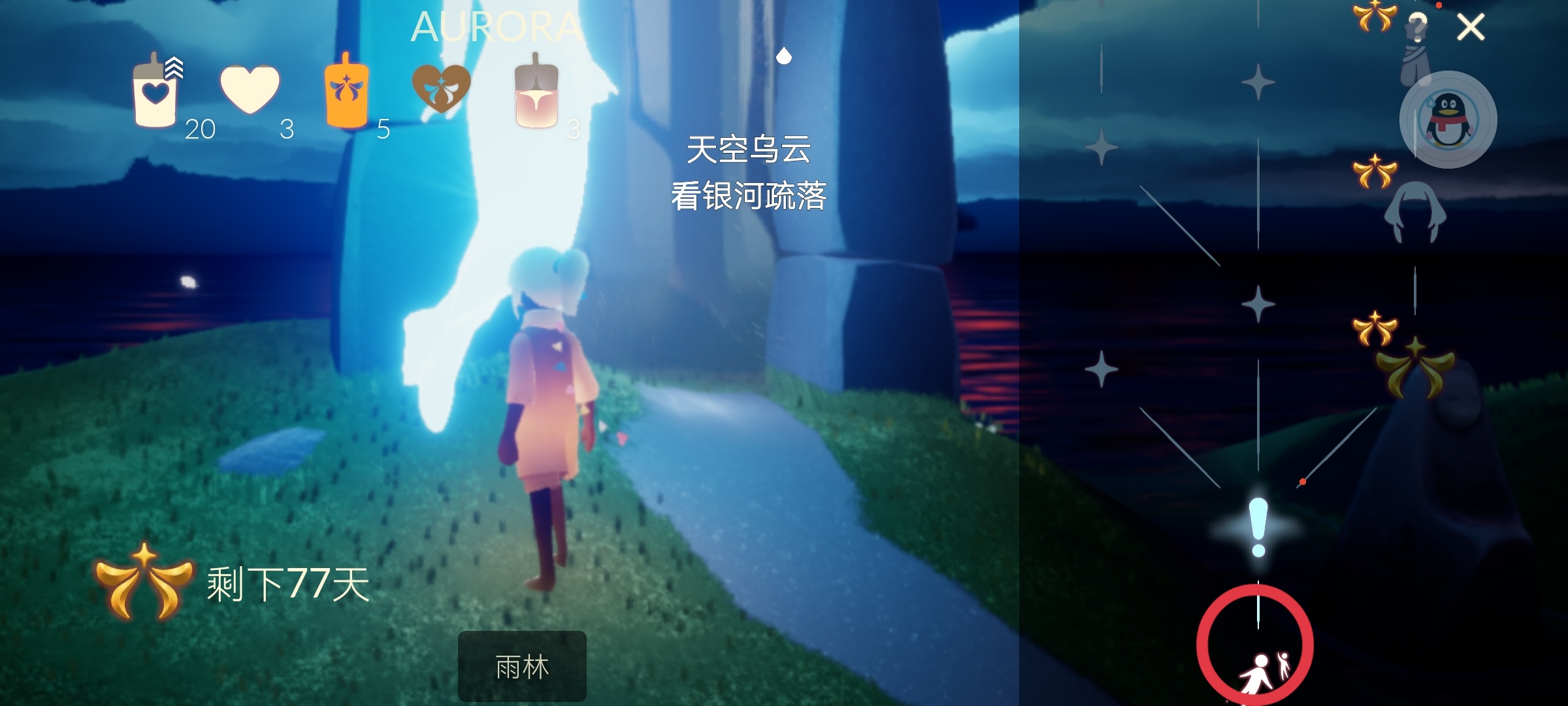 AURORA季季节地图位置及任务一是泽哦发布于 2022-10-18关注前往季节地图所在的地方,可以通过遇镜的向导传送过去。 也可以通过赛道、圆梦村、霞谷宫殿进入赛道终点,季节先祖及向导在终点左上角平台上。 AURORA季物品兑换图: 任务一教程及建议:领取任务后,将会传到晨岛,坐在白圈内就会开始任务。 做任务时建议听本任务内的歌,歌的速度也就是罩子移动的速度。开启任务期间,沿途的光翼都会消失,无翼可以放心的做任务。任务终点在左侧第二个光翼的台阶上,任务完成会被传送回启点。礼包购买及免费魔法领取都在赛道终点右上角的平台上。 任务一美图分享: