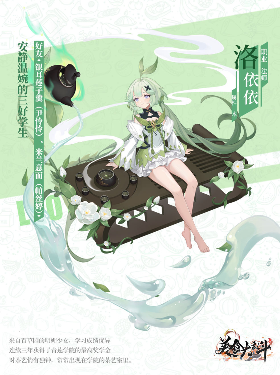 【食灵爆料】木系食灵——洛依依阳光浅笑发布于 2022-10-19关注名字:洛依依食物原型:碧螺春属性:木职业:法师————————————————性格:安静温婉设定:青莲学院的三好学生好友:银耳莲子羹(尹怜怜)、米兰意面(帕丝婷)、水晶马卡龙(伊丽莎白)、西芹百合(沐白)、黑女巫糖果(米狄亚)。————————————————【背景】来自百草园的明媚少女,学习成绩优异,连续三年获得了青莲学院的最高奖学金,对茶艺情有独钟,常常出现在学校的茶艺室里。