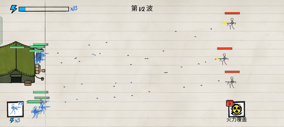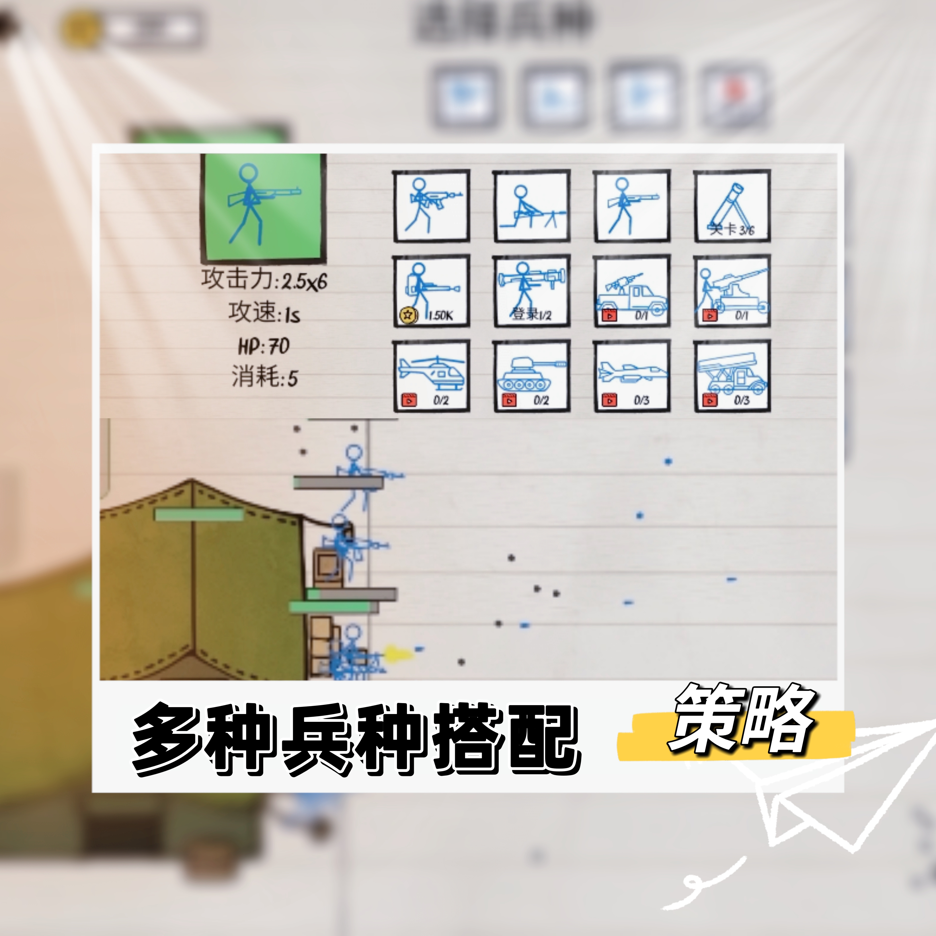 ✨游戏玩法:游戏的玩法比较独特,看着简单却到了后面关卡敌人的加强,胡乱招兵方法就显得无力了。这时候我们就需要用到一些策略了,如根据敌人的数量安排小兵(步兵)去吸引火力,主力部队(机枪、散弹等等)则是在旁边进行输出。