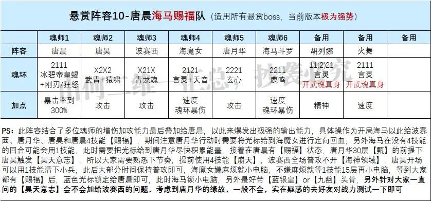 PS:针对不少朋友对于此阵容总,唐昊的【昊天意志】到底是会加给波赛西还是唐晨的疑惑,可能性的确是有的,如果大家波赛西的攻击力远远的超出唐晨,那么的确唐昊是有概率给波赛西加攻的,但普遍情况下由于唐月华的攻击只会加给强敏攻魂师,所以考虑到这一范畴唐昊加攻给波赛西的可能性并不会很高,为了稳妥期间大家可以在好友对战中去模拟一下,然后在唐昊触发【昊天意志】前后,通过1倍速记录一下波赛西和唐晨的普攻伤害变化即可探明