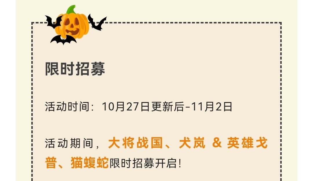 本周的返场已经出来了,分别是大将战国,犬岚,猫蝮蛇,英雄卡普