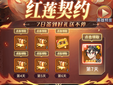 2、迎SP英雄上线,【红莲契约】签到活动开启,累计可得10连抽+哪吒本体;