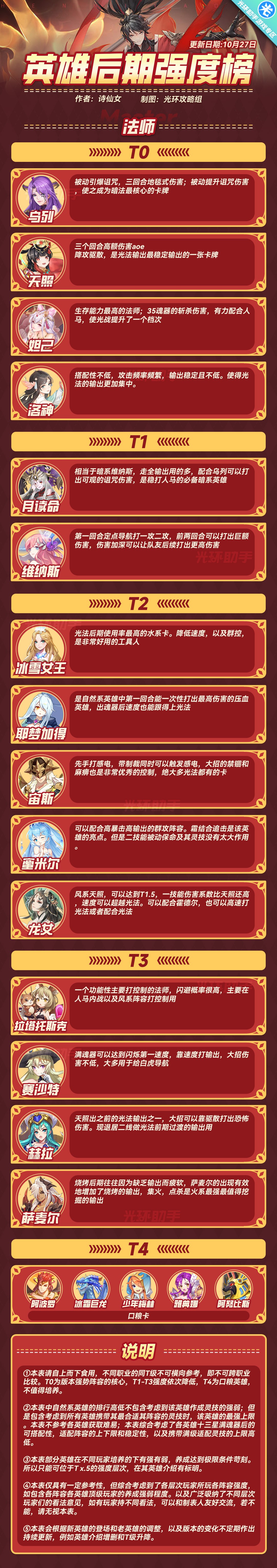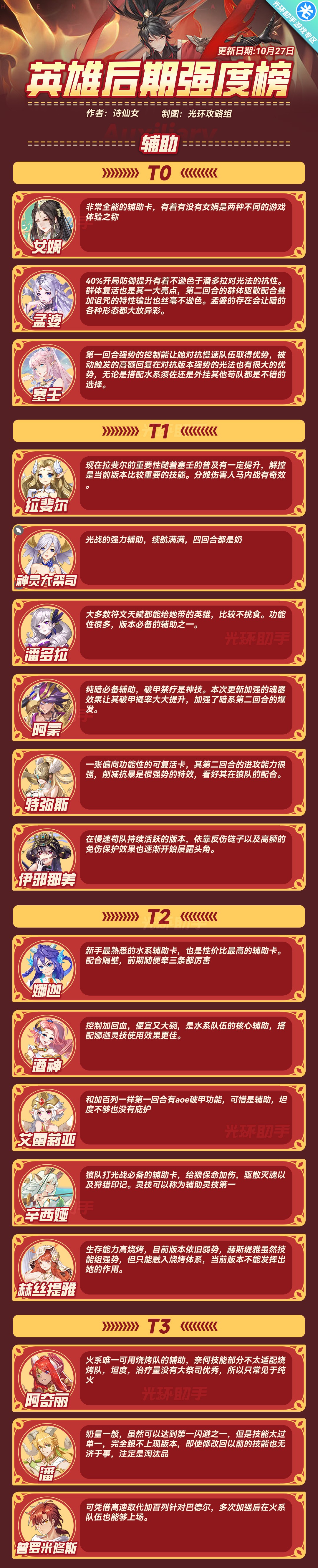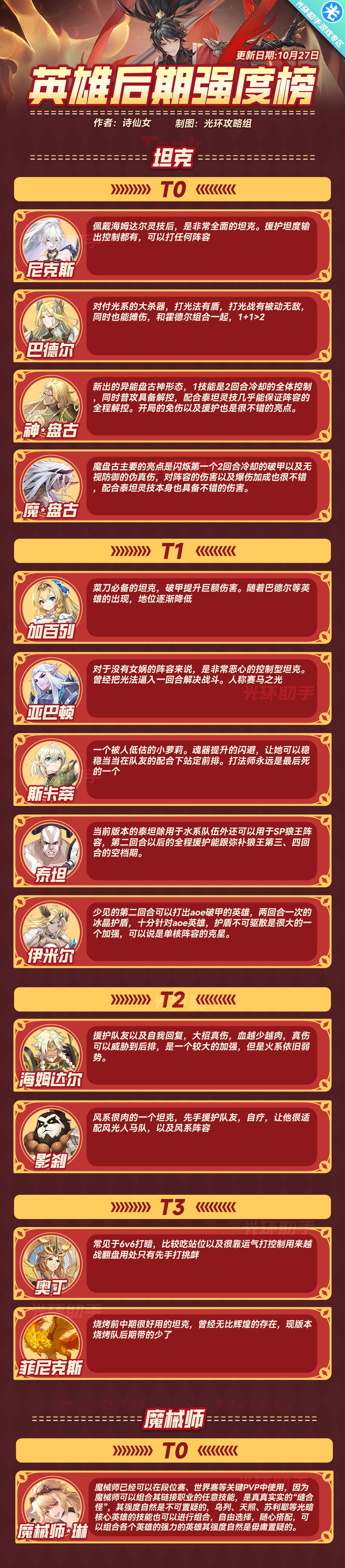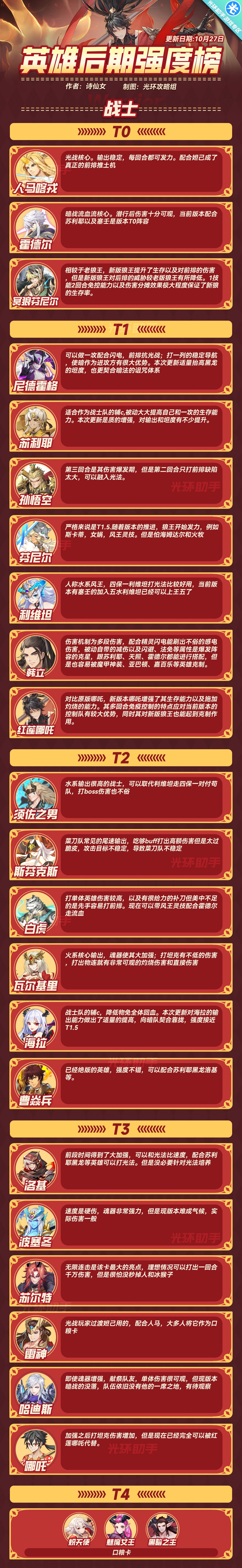 【10.27版本更新】新英雄红莲哪吒诗仙女发布于 2022-10-27关注本次更新:1.火系新英雄红莲哪吒降临,强度暂列t1,相对于老哪吒,其生存能力以及叠加灼烧的能力得到大幅度加强,但是其绑定火系的特点以及面对光法,人马有一定劣势的情况下暂列t1,如果能有相应应对光法以及人马的搭配出现可以列入t0。2.韩立因为克星较多,评级下降至t1。
