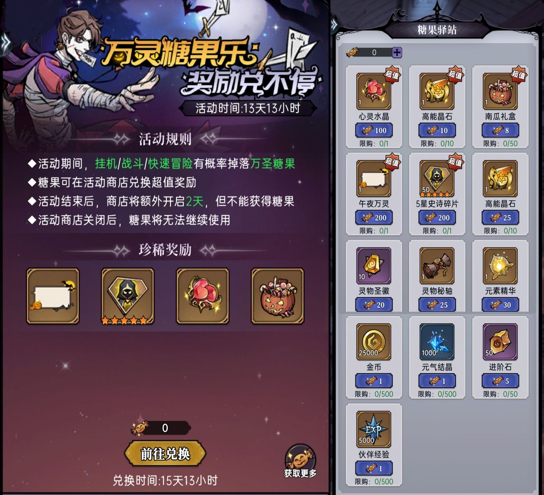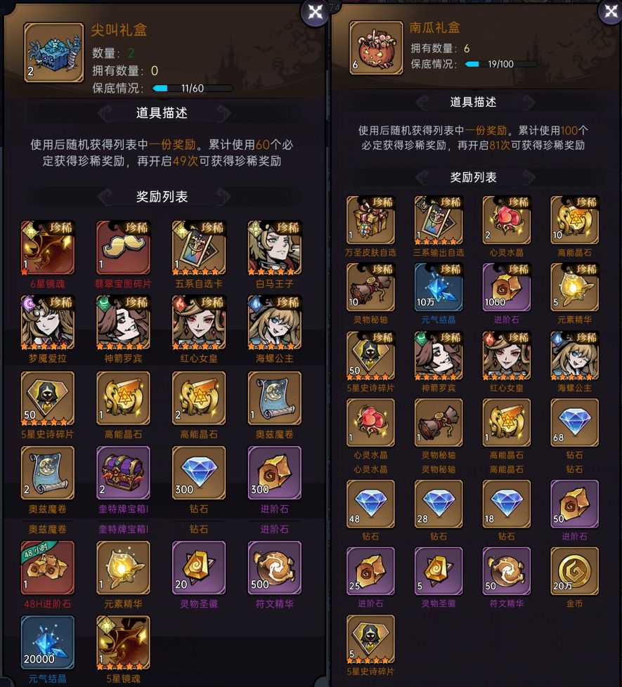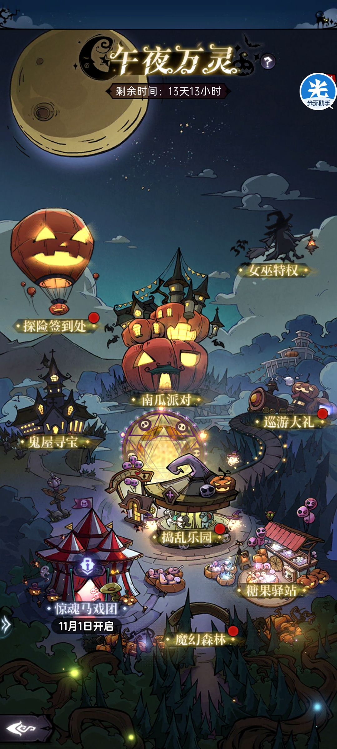 活动期间每日主城将随机出现「南瓜」,玩家点击可获得丰厚奖励, 包括高能晶石、符文精华和灵物秘轴,集齐全部彩蛋即可获得 钻石*1000的高能奖励