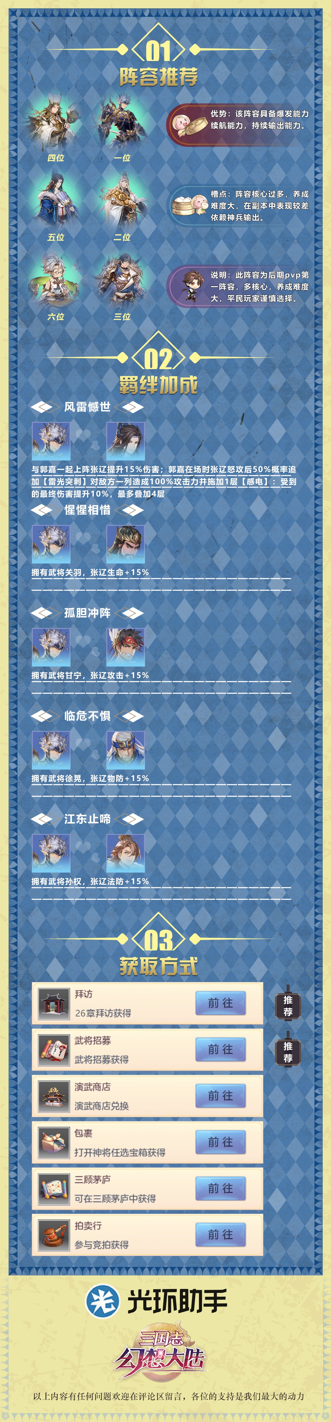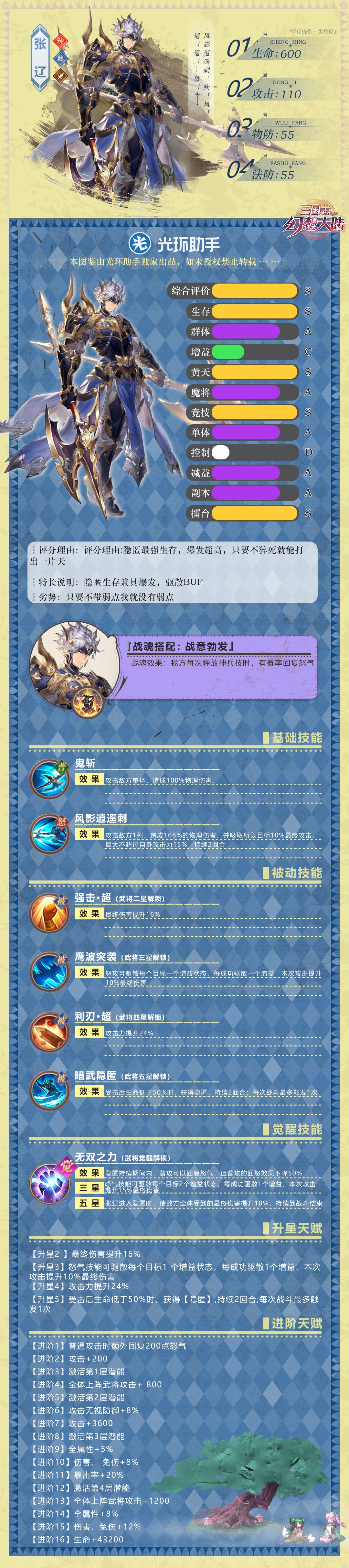 【光环独家】张辽分析和图鉴光环-盒子发布于 2020-05-20关注 “无畏队”攻略———吴魏联军发展心路历程 引言大家好,我是小白,今天给大家带来一篇新阵容的攻略和发展方向,所谓吴魏联军,当然就是由吴魏阵营组成的队伍 阵容方面,过渡以及阵容变更七天乐阵容:太史慈,周泰,郭嘉,张辽,蔡文姬,王异(孙坚)十四天乐 ↑“无畏队”攻略———吴魏联军发展心路历程↑ 热门阵容推荐 阵容推荐盘点热门及曾经热门的阵容(不分排名,只分热门)司马懿搭配阵容繁多,羁绊组合不固定。不列举。群雄队之前说过了。不列举天象队:赵云、诸葛亮、张辽、郭嘉、左慈、华佗。 PVE :☆☆☆☆☆ PVP ↑热门阵容推荐(张辽)↑ 【皮皮的攻略】武将强度解析系列之昭虎张辽 大家好,我是小猪皮皮。。。 这个系列做的是武将强度评测,希望能让大家了解每一个武将的特性和强度,后续我会更新全武将解析的,希望大家多多支持~~~本期文章给大家带来的就是魏国人气武将——昭虎张辽的一个细 ↑武将强度分析↑未经授权不得转载使用。9月27日更新