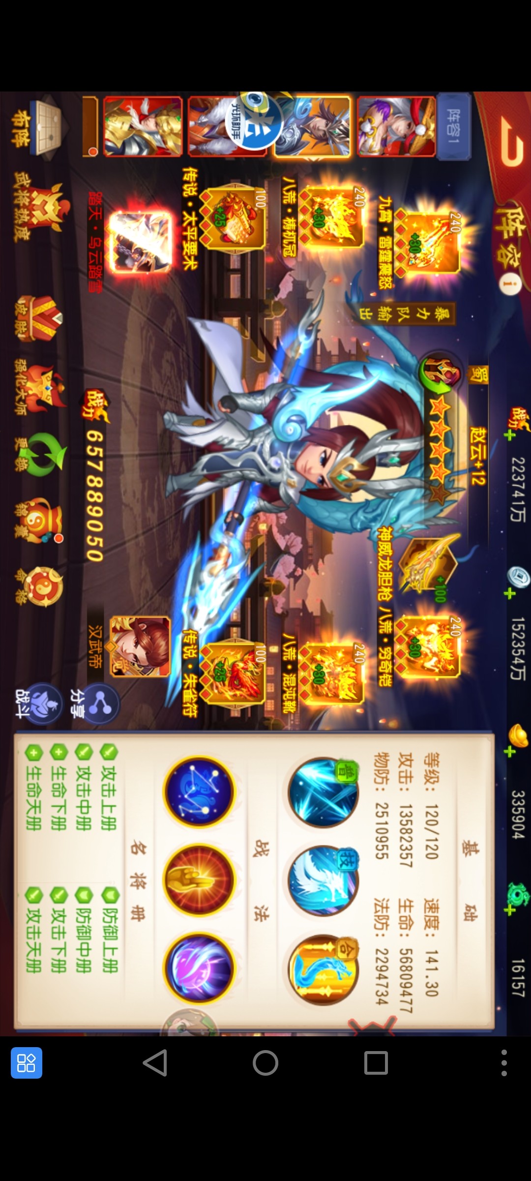 你这赵云估计暴击不够,你把宝物换成暴击属性的,玉石再加两三个暴击玉石,伤害还能提升一大截,当然命中率也不能落下,可以通过开阵法暴击和命中都可以提升