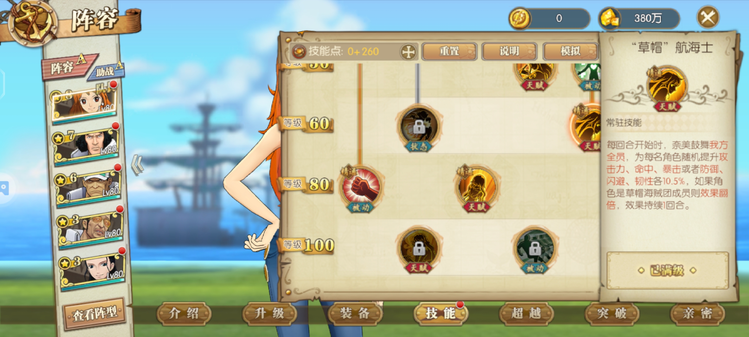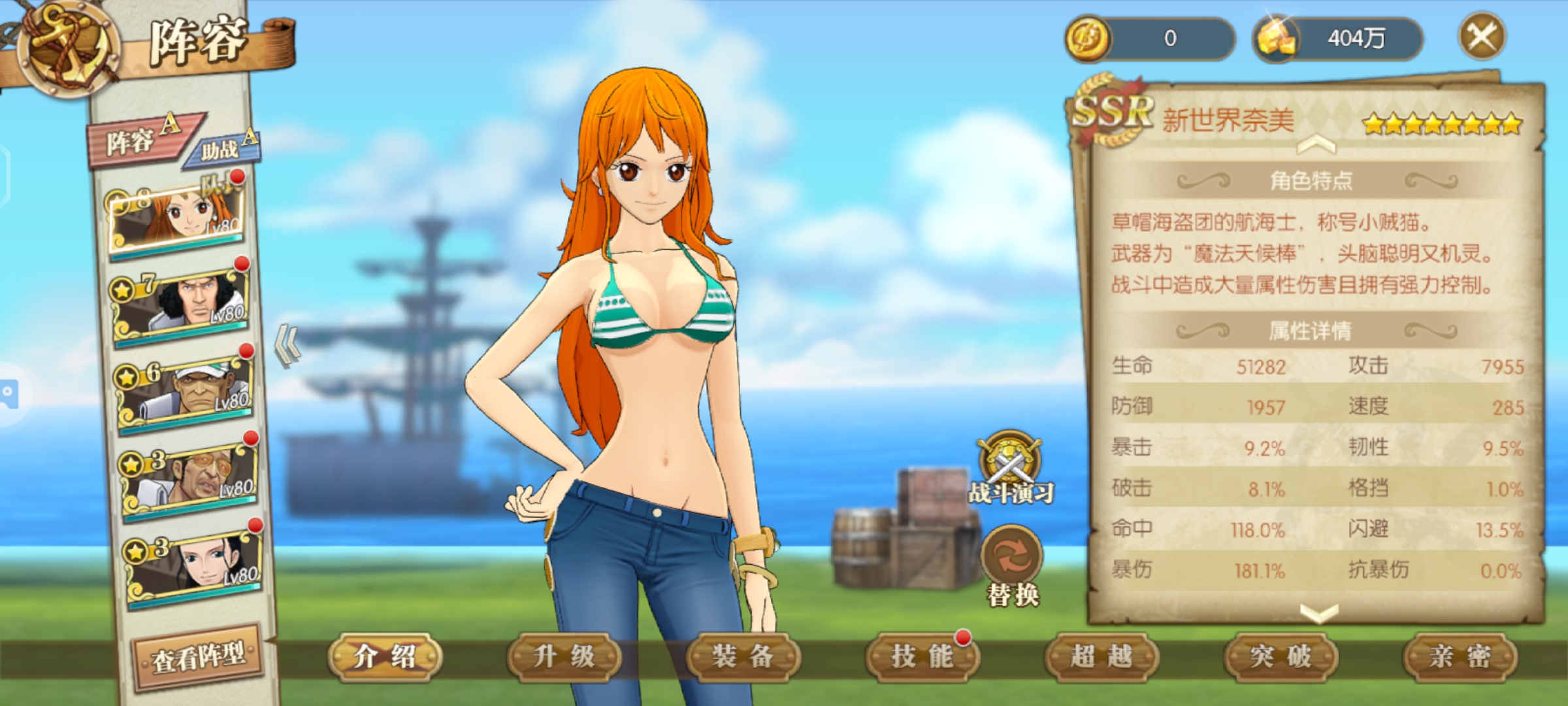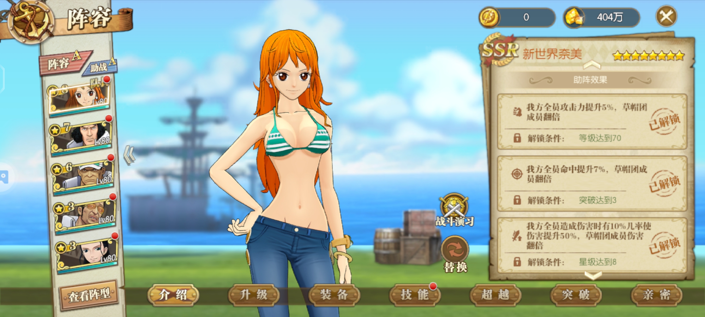 娜美助阵加攻击命中,技能伤害有概率提升50%很强的助阵角色,要是给草帽团助阵翻倍超级牛逼伤害甚至可以翻倍,如果未来有和之国草帽团那么一定少不了娜美助阵