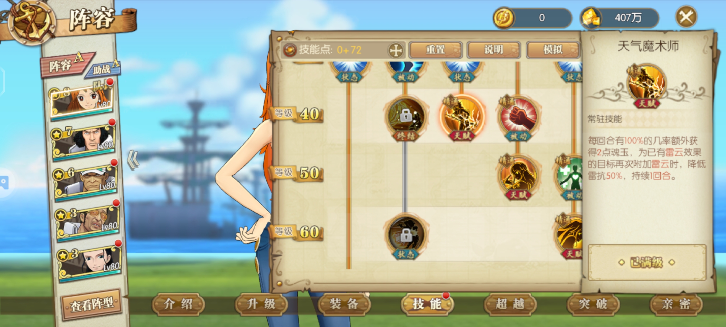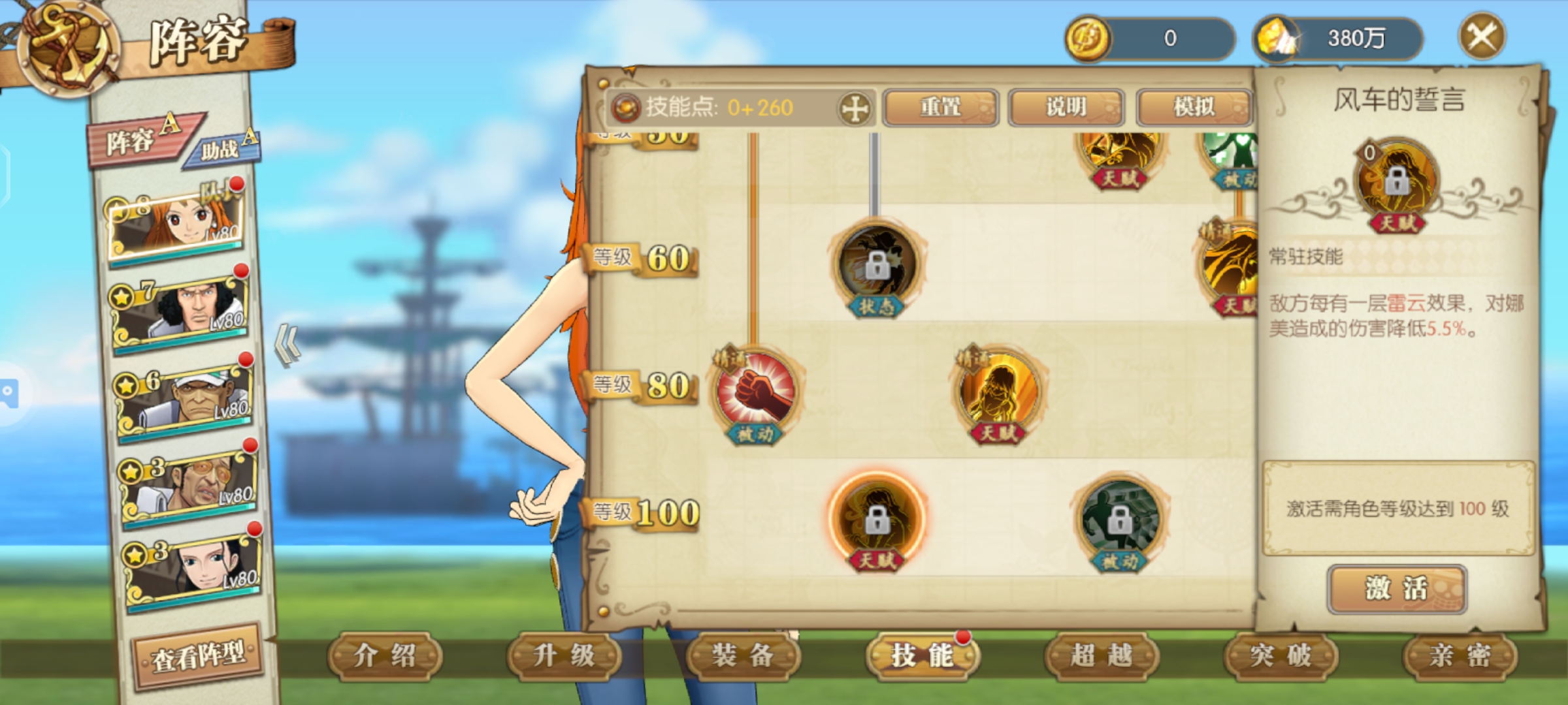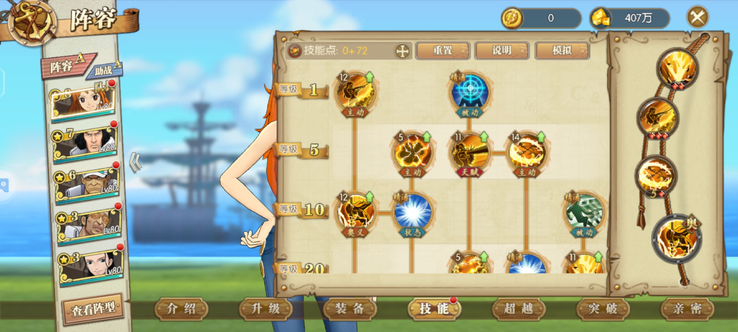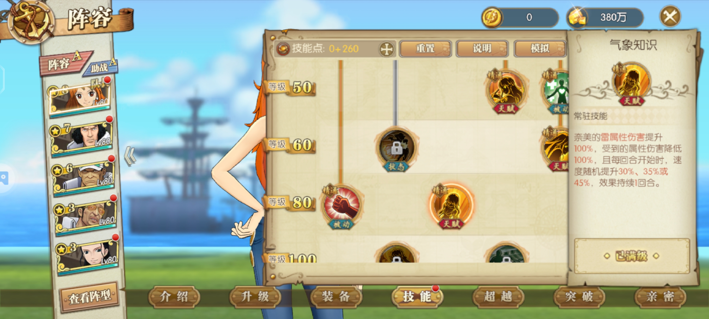 娜美助阵加攻击命中,技能伤害有概率提升50%很强的助阵角色,要是给草帽团助阵翻倍超级牛逼伤害甚至可以翻倍,如果未来有和之国草帽团那么一定少不了娜美助阵