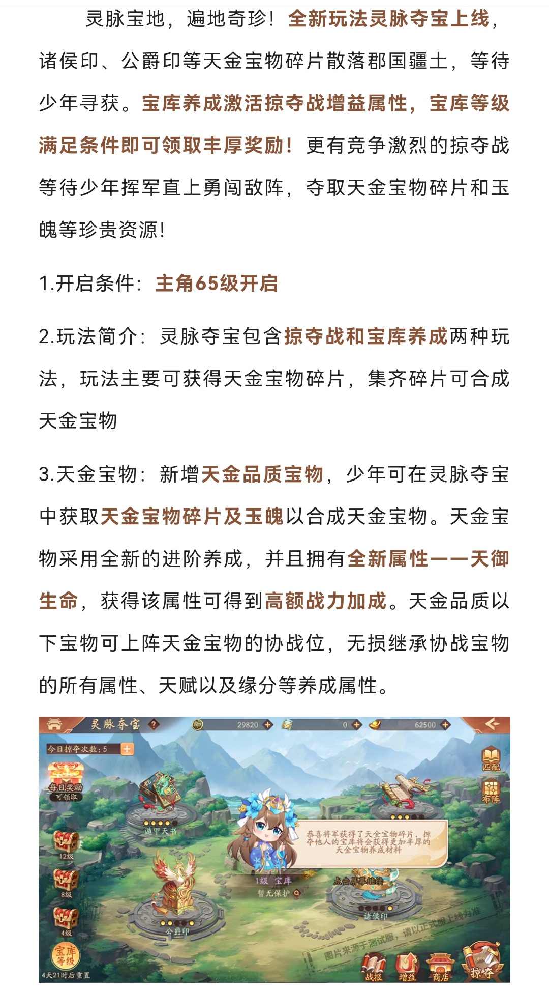 1、灵脉宝库夺宝,65技开启,天金宝物碎片和养成材料