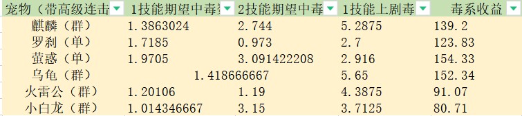 特别说明一下,这里毒系收益的伤害参考的是3力加点的萤惑,所以收益会看着很大。因为所有宠物参考同一伤害才能看出谁综合上毒能力最强。
