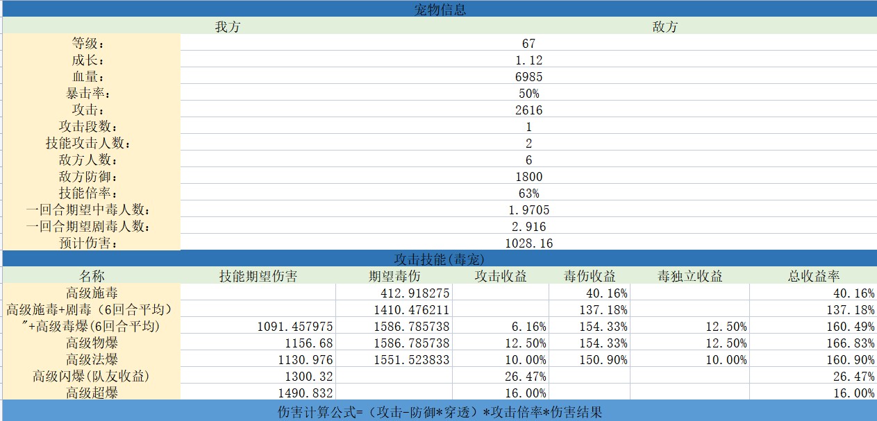 开始说正事,上文说到了毒系宝宝4件套基本是必备的,所以这里的毒系收益即这4个技能联合在一起的收益。