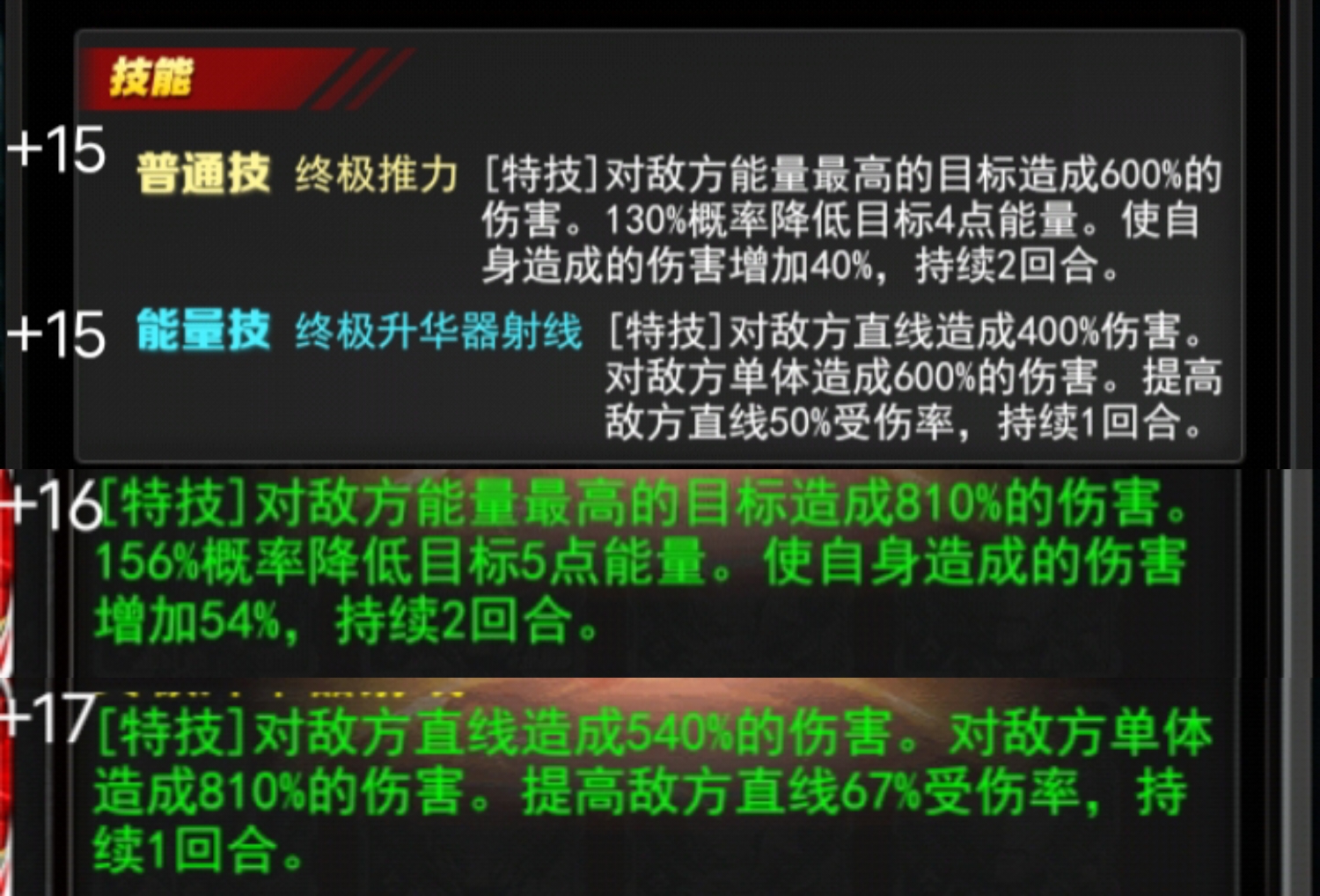 +15 能量技终极升华器射线[特技]对敌方直线造成400%伤害。对敌方单体造成600%的伤害。提高敌方直线50%受伤率,持续1回合。