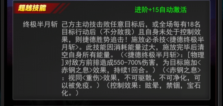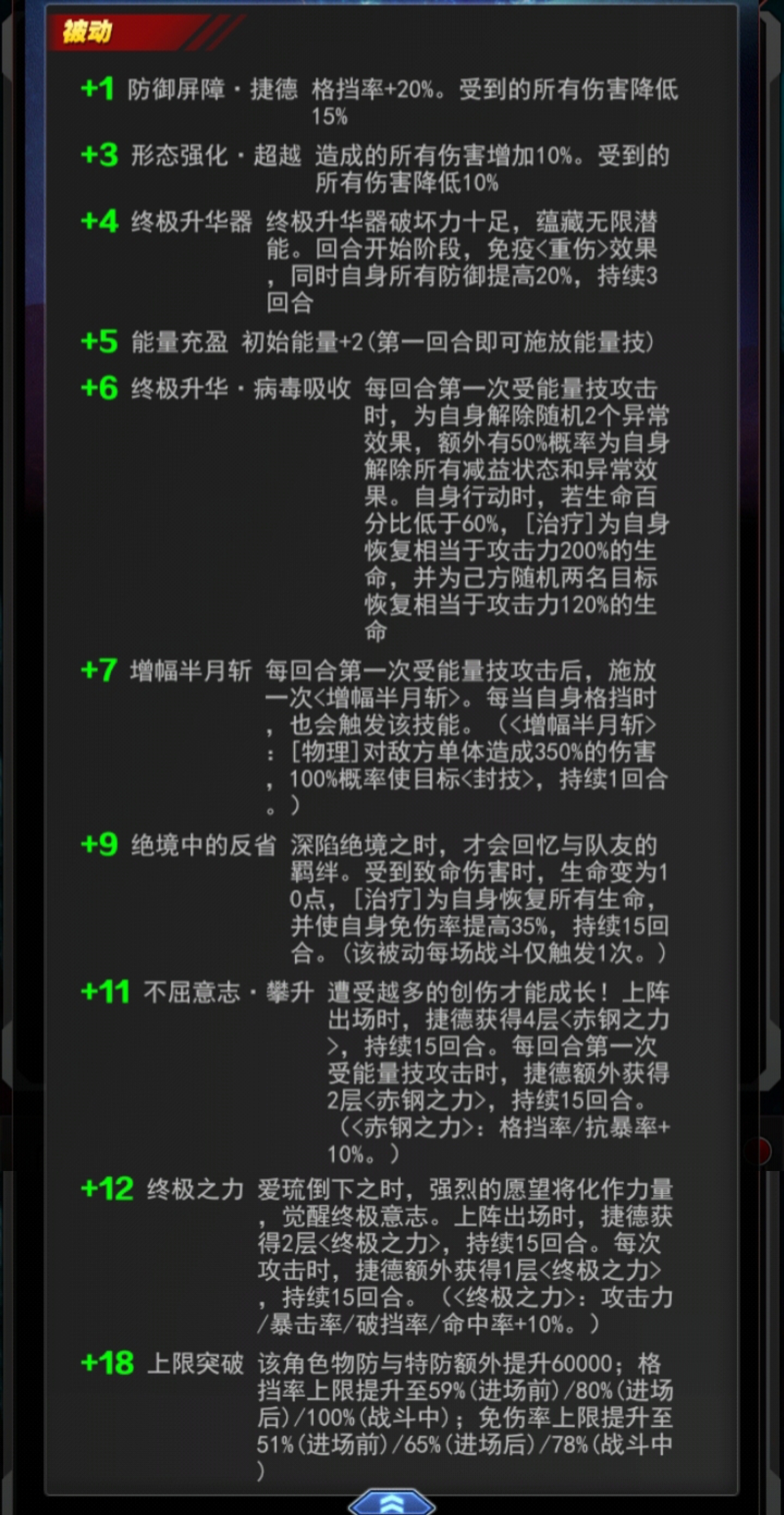 +11不屈意志·攀升 遭受越多的创伤才能成长!上阵出场时,捷德获得4层<赤钢之力>,持续15回合。每回合第一次受能量技攻击时,捷德额外获得2层<赤钢之力>,持续15回合。(赤钢之力,格挡率/抗暴率+10)