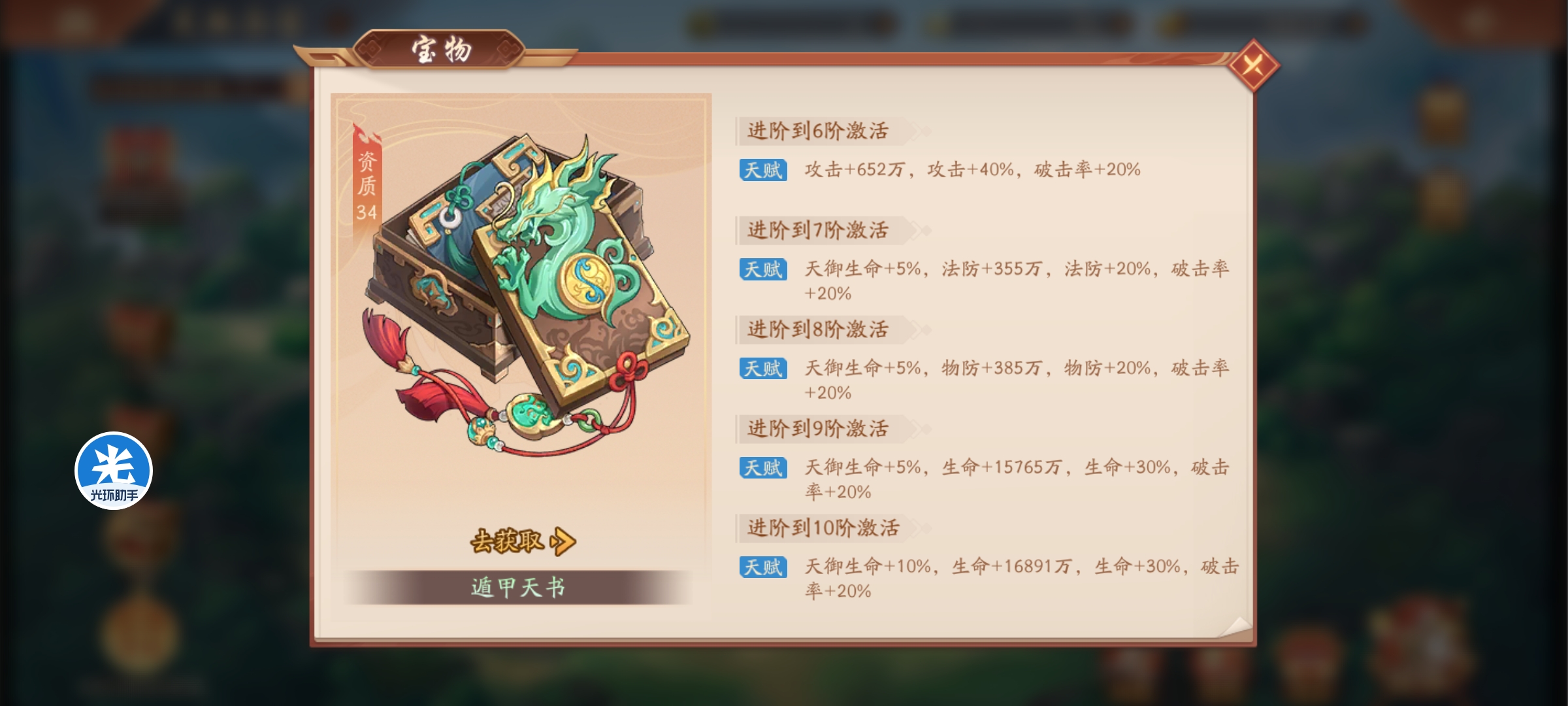 四个天金宝物直接让其他宝物断层了,天金以下宝物的资源都可以不管了。资质34,基础属性大幅提高,进阶后加天御生命。