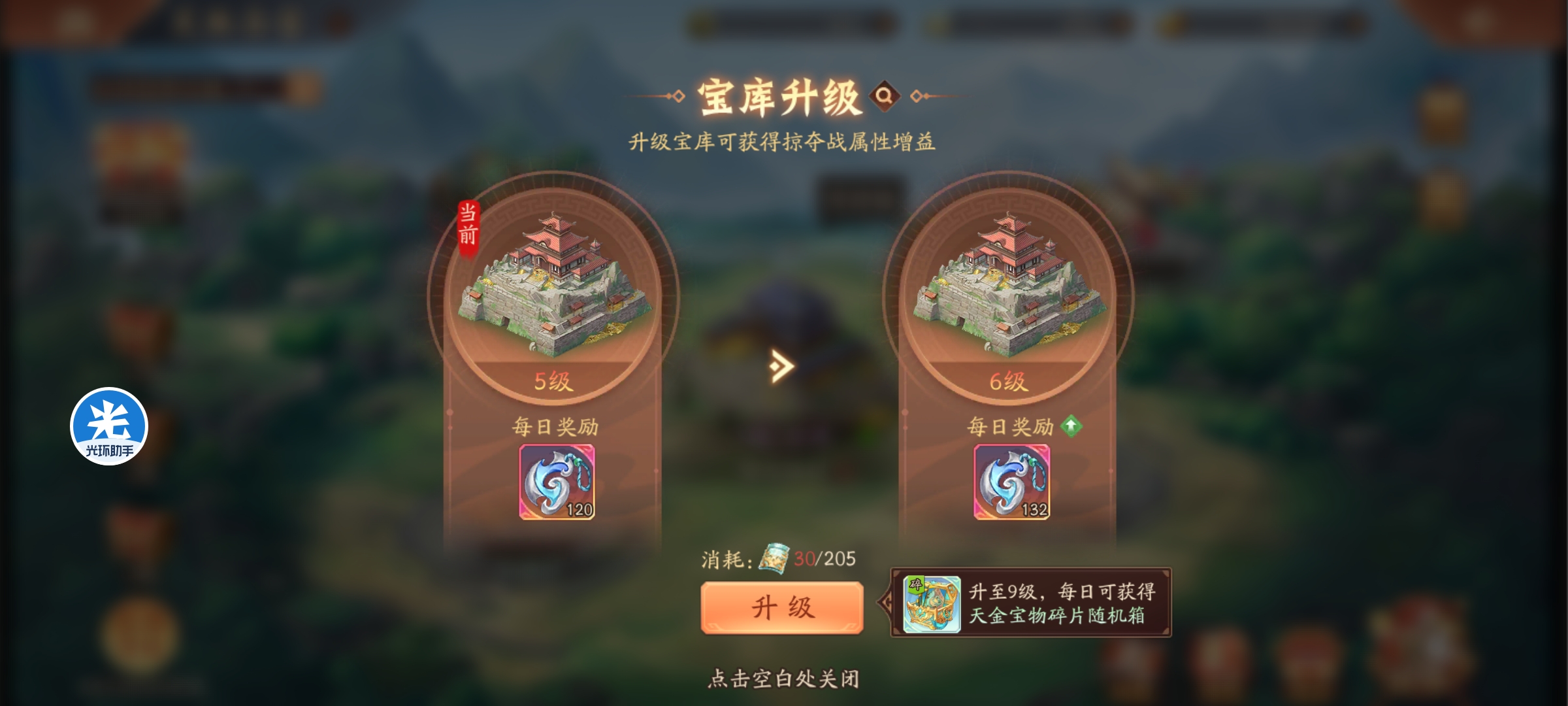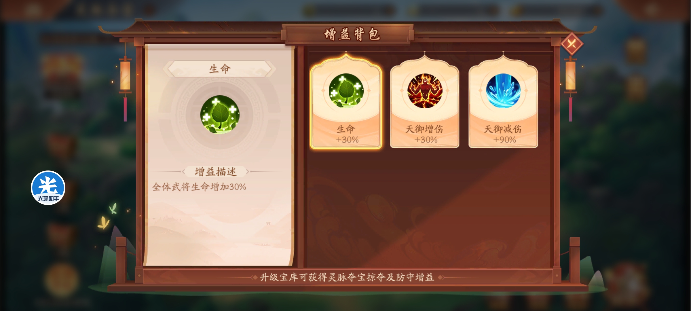 每次宝库升级可以选择增益,参照无双试炼的标准,优先天御增伤、减伤和生命,然后是增伤、减伤和生命。防御和暴击、抗暴那些在玩家对战中已经废了,可有可无。