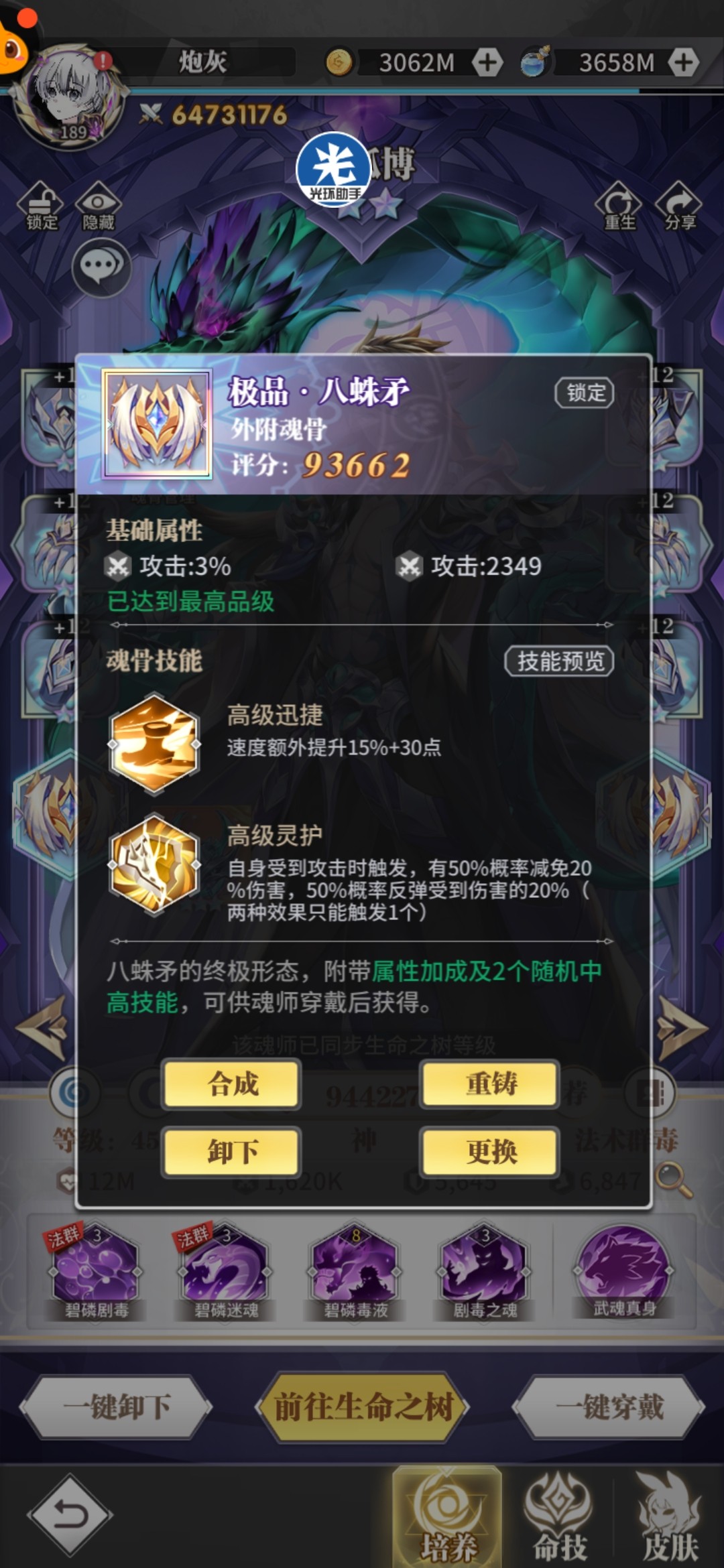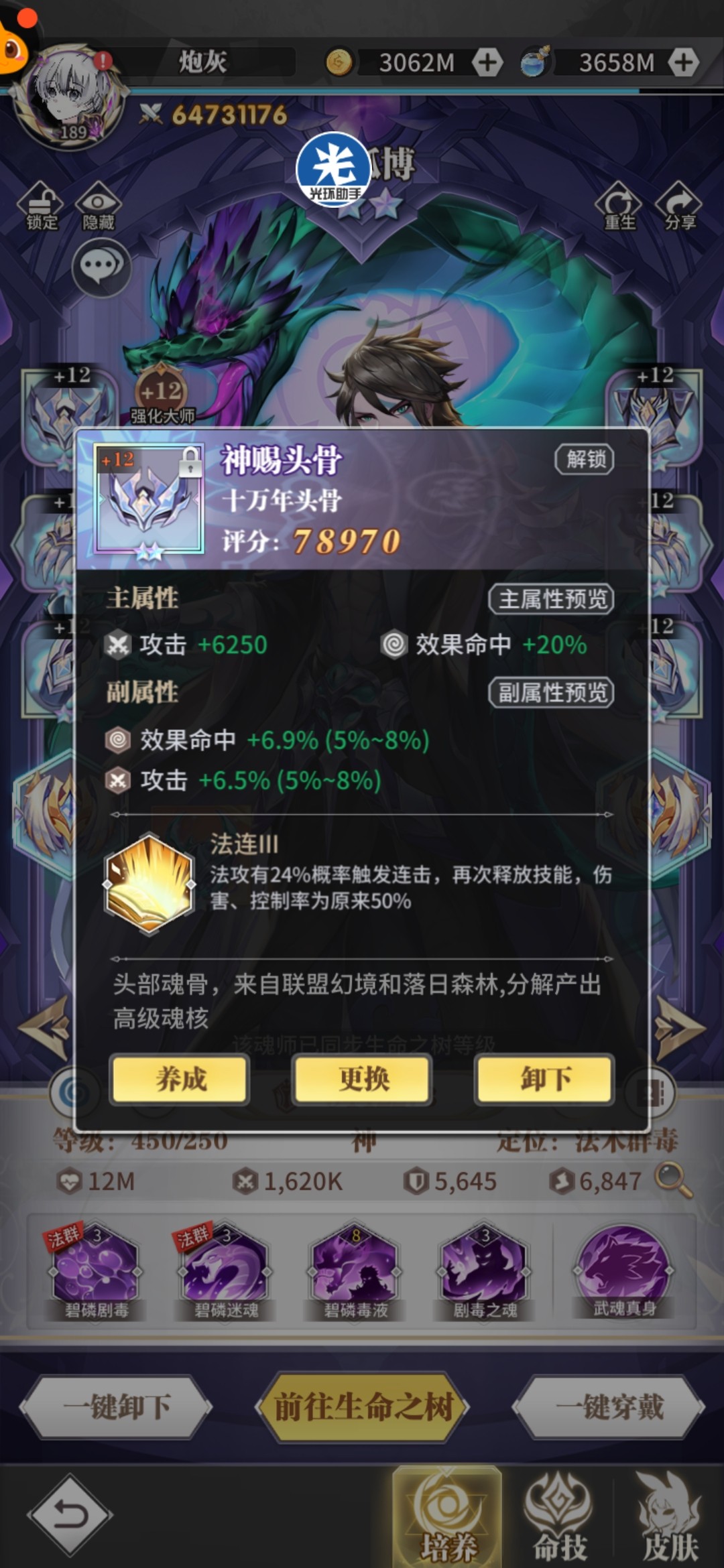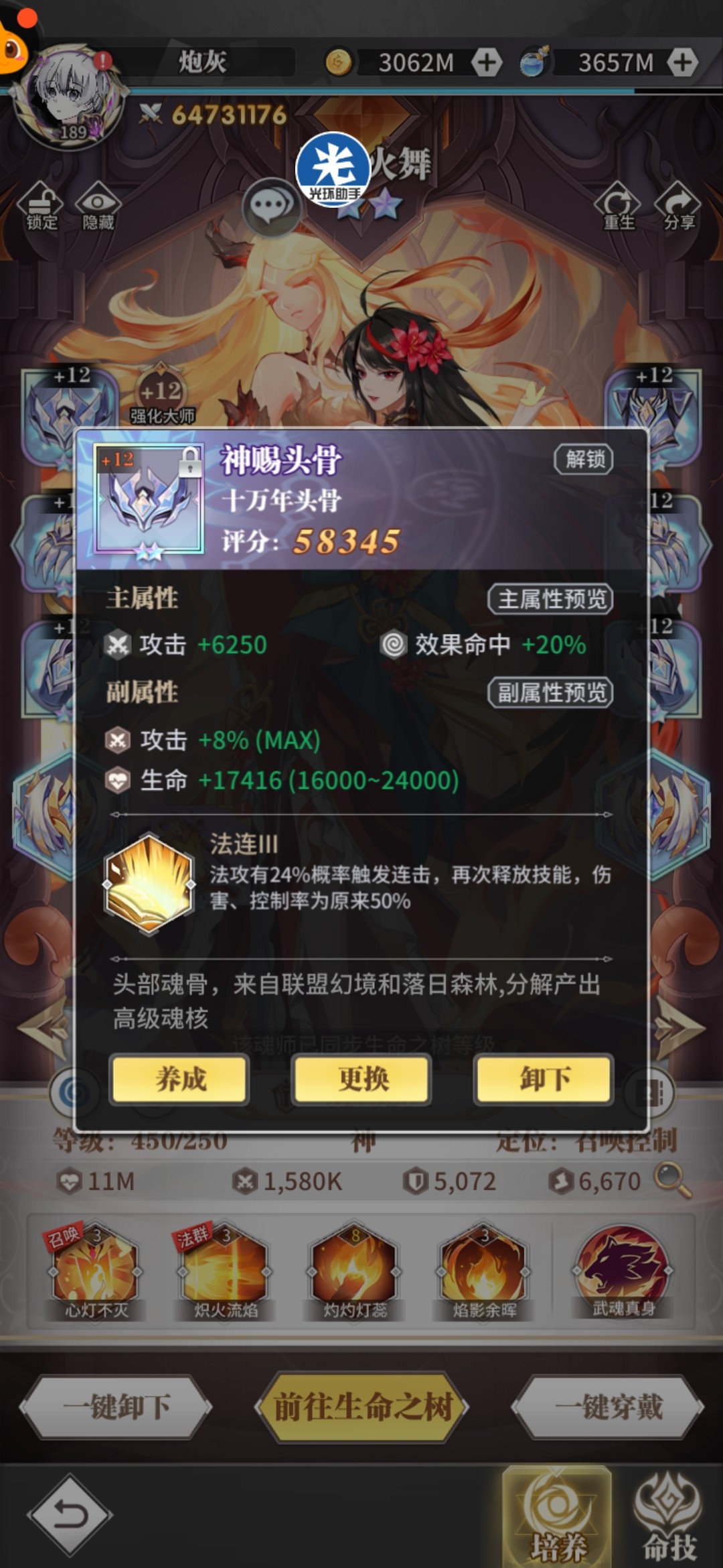 头骨:法连,主要是副属性攻击百分比+效果命中/攻击值,因为灼烧看的是魂师攻击强度,所以攻击是灼烧队最重要的属性。